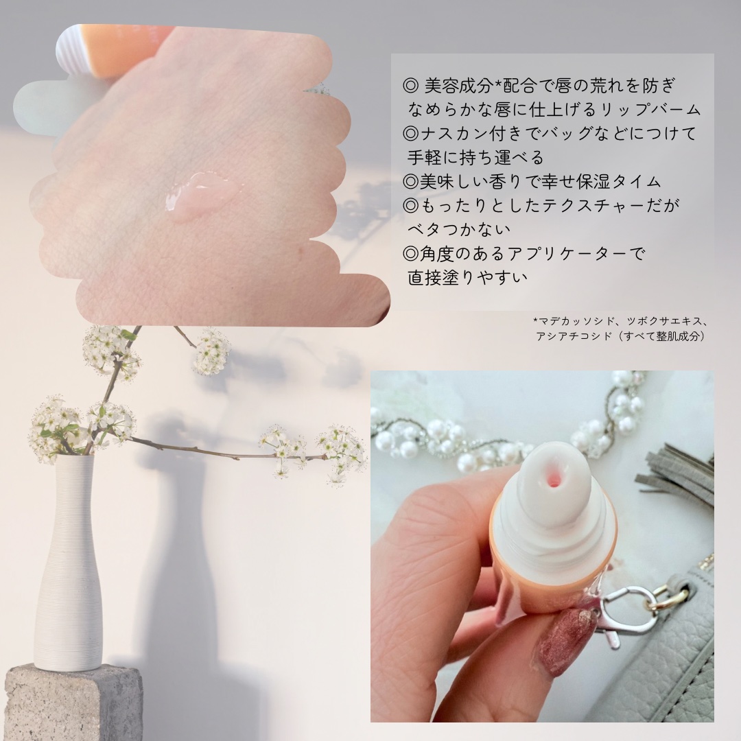 美容成分*配合で唇の荒れを防ぎ、なめらかな唇に仕上げるリップバーム🩷 *マデカッソシド、ツボクサエキス、アシアチコシド(すべて整肌成分) バターのようななめらかなテクスチャーで唇がツヤツヤプルプルな仕上がりに、、、🧡しっとりするから乾燥しやすい季節にピッタリ!! グレープフルーツのような柑橘系の香りがするのも特徴的🍋