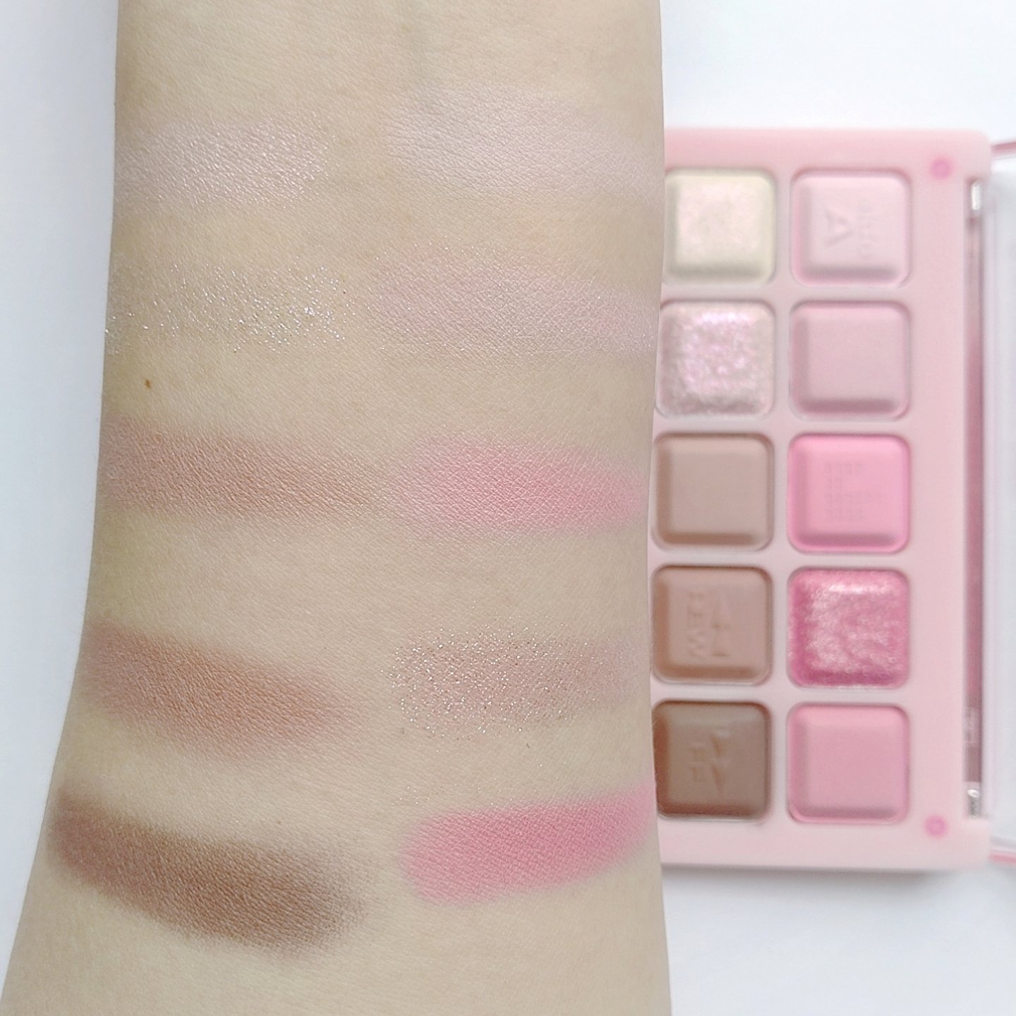 10色入りのアイシャドウパレットです。色味は青みよりの鮮やかなピンクで、青みと鮮やかさが得意なブルベの方におすすめです。 粉質はしっとりしていて密着力が高いです。ラメも密着力が高くて使いやすかったです。 全体的にピンクなのでピンクメイクをしたい時にぴったりなパレットです。