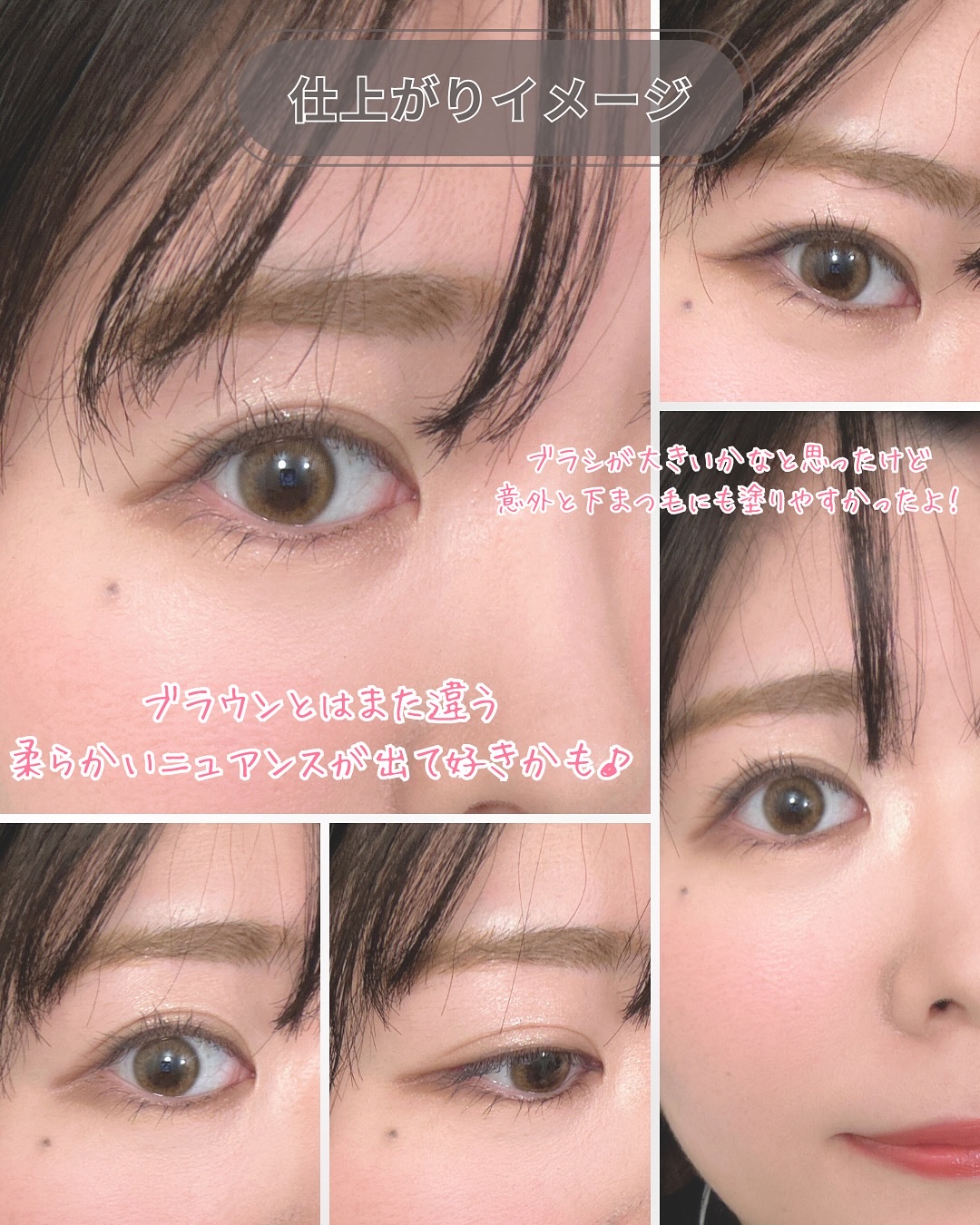 新色のゆうぐもグレージュは、黒に白を一滴プラスしたようなカラーで、透け感のあるブラックって感じの仕上がりになるよ🫶🏻 普通のブラックだと主張強すぎて、ブラウンだと存在感が薄すぎる...ってなっちゃう人にもおすすめ✨ スカイリフトブラシは、ブラシとコームのいいとこどりで、液がつきすぎないからダマにもなりにくいのがまじで良い~~👍🏻