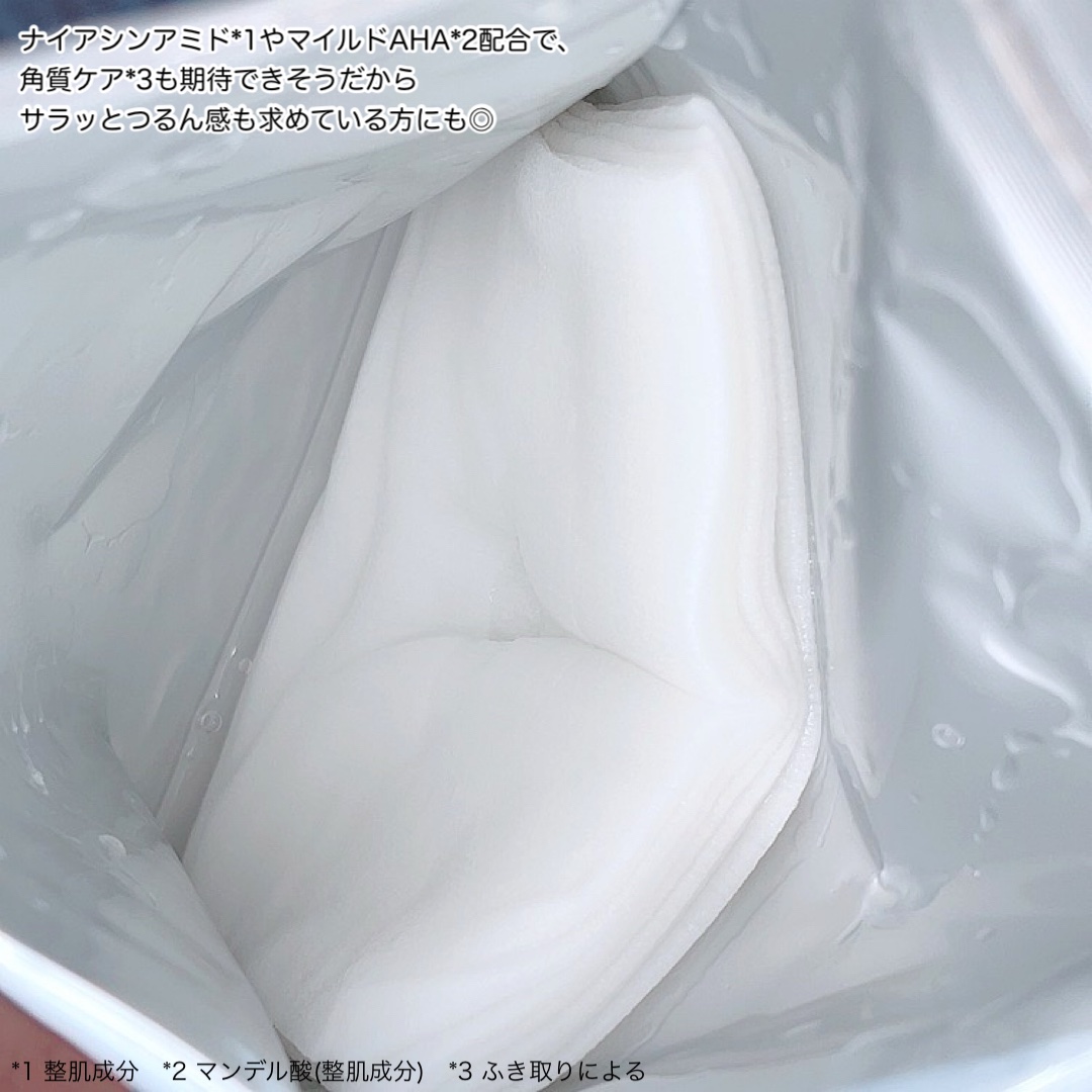 - 肌荒れ・皮脂ケア※1と健やかな肌の土台※2美容を叶える、アゼライン酸誘導体*1配合のうるおいツヤ肌管理マスクです。 肌荒れや肌の赤み、毛穴目立ちが気になる方に。 アゼライン酸*1×ナイアシンアミド*2+次世代ヒアルロン酸*3配合で、肌荒れをケアし、角質層をみずみずしいうるおいで満たします。 さらに肌表面でゆっくりと働くマイルドAHA*4が、古い角質をやわらげ、キメを整えることで、つるんとツヤめく素肌へ導きます。 シートはとろけるように肌に密着するメルティーフィールシートを採用。 シートが最も柔らかく感じられる液量を研究し、まるで水の層に包まれているような心地よさを実現しています。 (※1 ふき取りによる ※2 角質層のこと *1 肌荒れ防止成分 アゼロイルジグリシンK *2 整肌成分 *3 肌荒れ防止成分 加水分解ヒアルロン酸Na *4 整肌成分 マンデル酸)