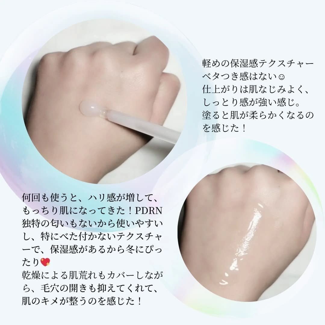 PDRN 塗るサーモン注射!肌再生&毛穴引締 針美容液の保湿感にも注目!針&微細ヒアルロン酸粒子で PDRNをより深く届けさせ、冬の乾燥にも負けない保湿感を与えるよ! 肌がワントーン明るくなって、肌キメが整ったこと! 毛穴の開きが気になってたけど、徐々に良くなっていっていて、嬉しい!