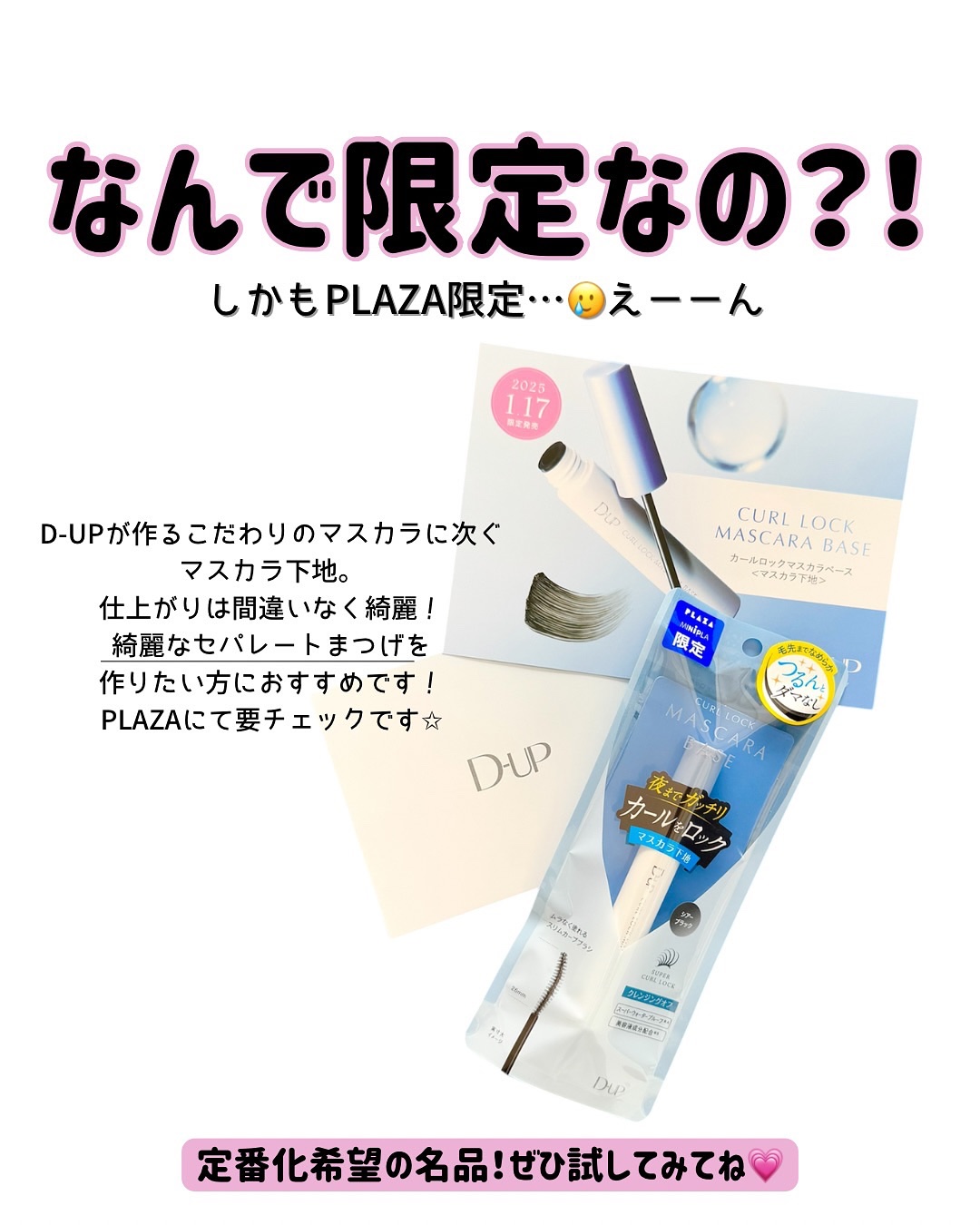 PLAZA・MINiPLAで限定発売されているマスカラ下地です🪄 D-upの大人気のお湯オフのマスカラは、私のまつ毛ではカールが上がらなくて💦 ウォータープルーフなので、落とす時はポイントメイクリムーバー使用がよかったです。