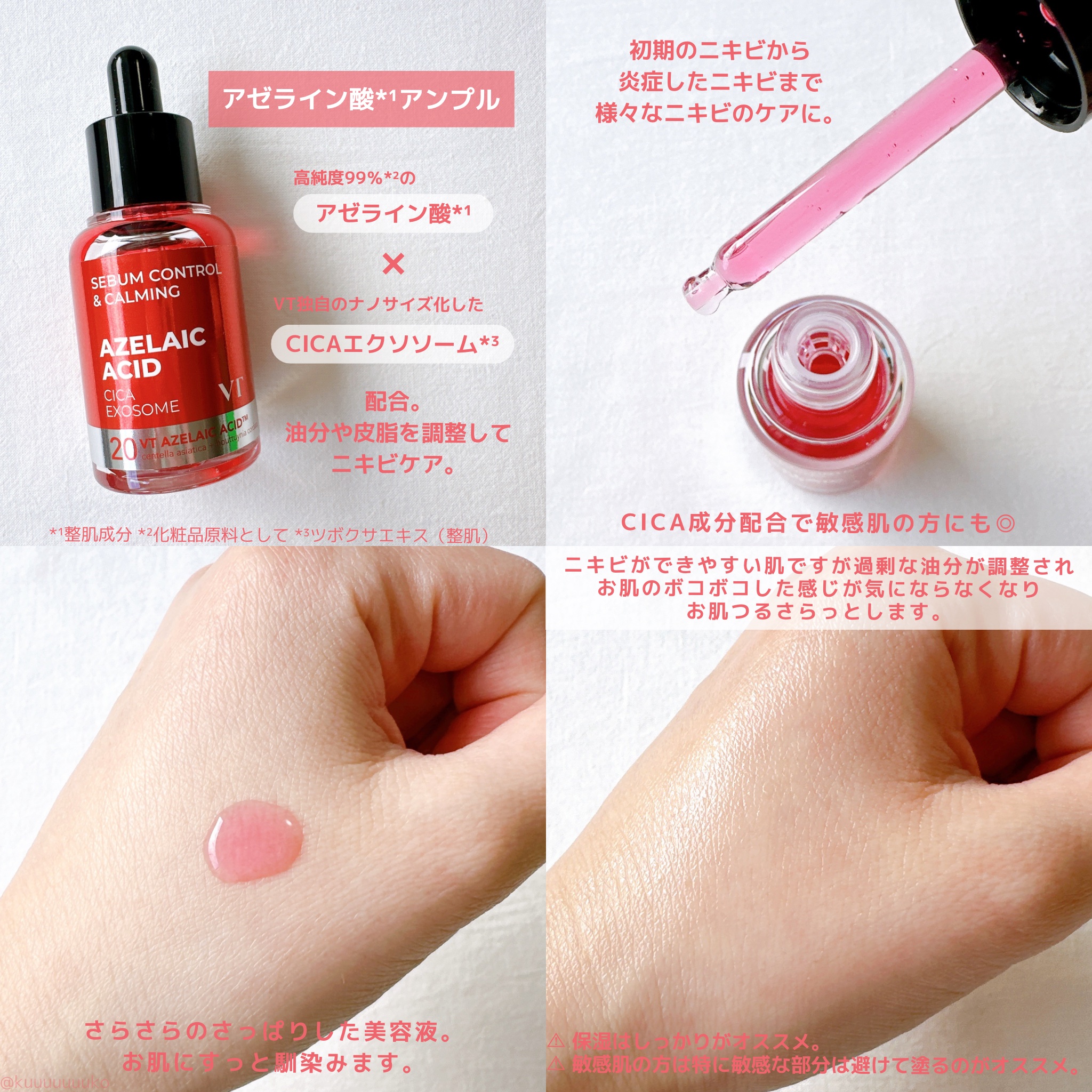 高純度99%アゼライン酸配合! 事前に塗ることでニキビを予防 炎症ニキビはやさしく鎮静 更に出来てしまったニキビ跡までしっかりケア🍃 CICA配合のアゼライン酸アンプル✨ VTならではの鎮静システムであるCICAエクソソームを配合! 敏感肌ですが刺激なく使うことができました! スーッと伸びてはやくなじむ!さっぱりとした水分感のある質感です💧