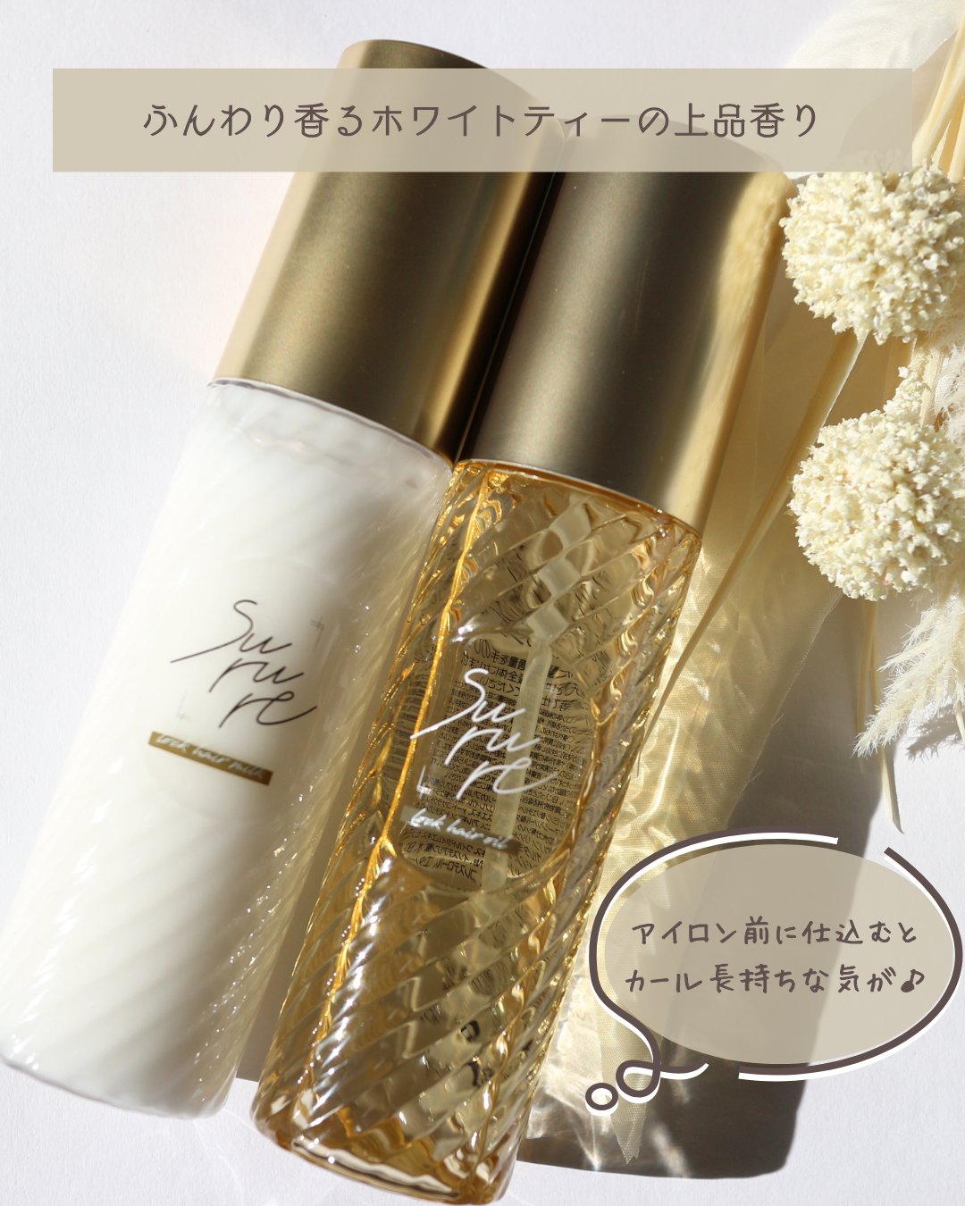 熱を味方にスタイリングキープ!! 乾いた髪に塗って、ヘアアイロン等で仕上げてね( ˘ω˘ 🫶) ▶ミルクは軽いスタイリングにしたい人や乾燥が気になる人、ショートヘアや猫っ毛にオススメ‼️ 心癒されるホワイトティーの香りで、清楚な香りだったよ🤍