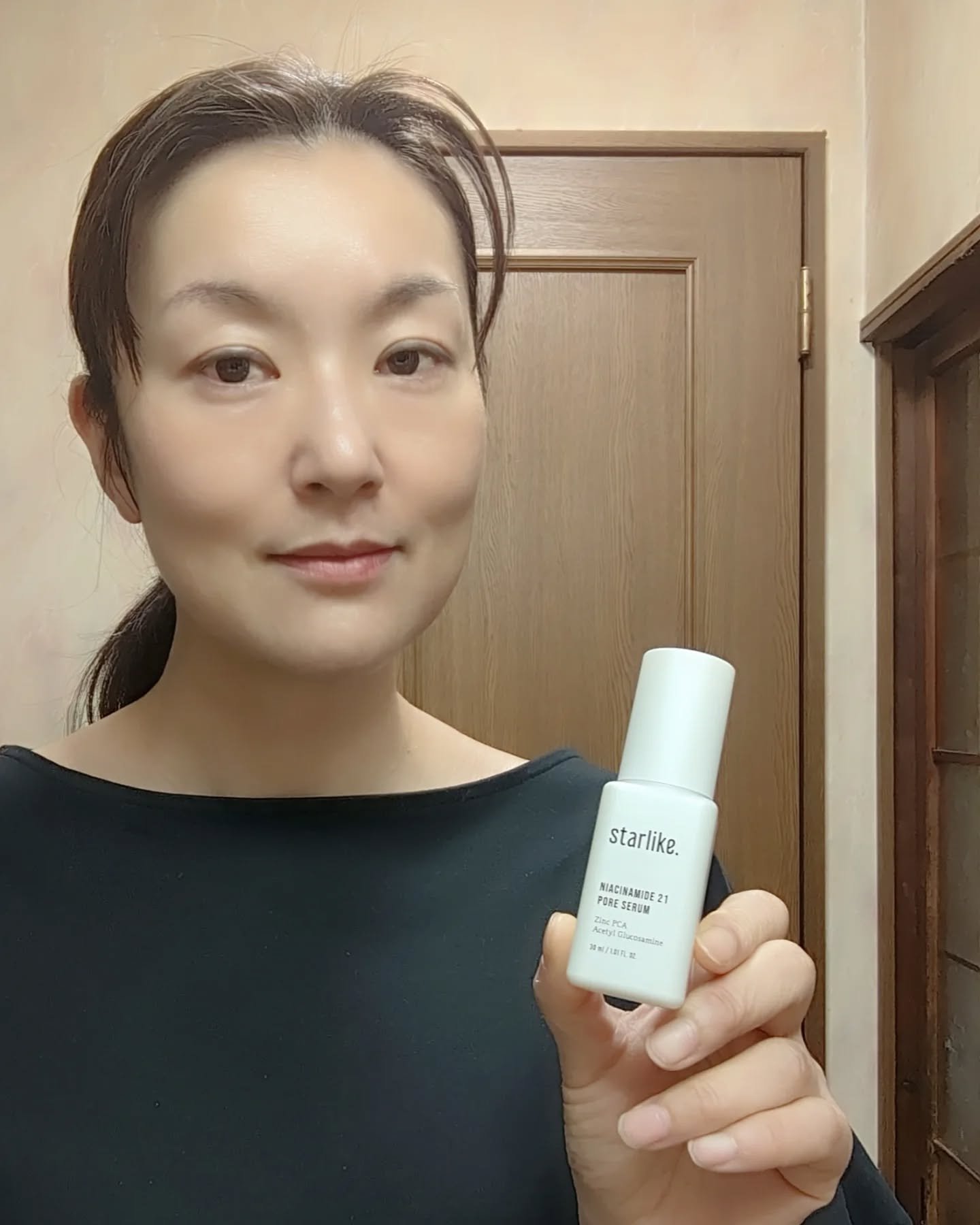 最近人気急上昇中のstarlikeのナイアシンアミドセラム✨ 何種類かある中の、白いボトルのものです! ナイアシンアミド21%配合しているこちら💁♀️ 透明でとろみのあるテクスチャー。 臨床立証された毛穴改良、皮脂減少の効果があります。