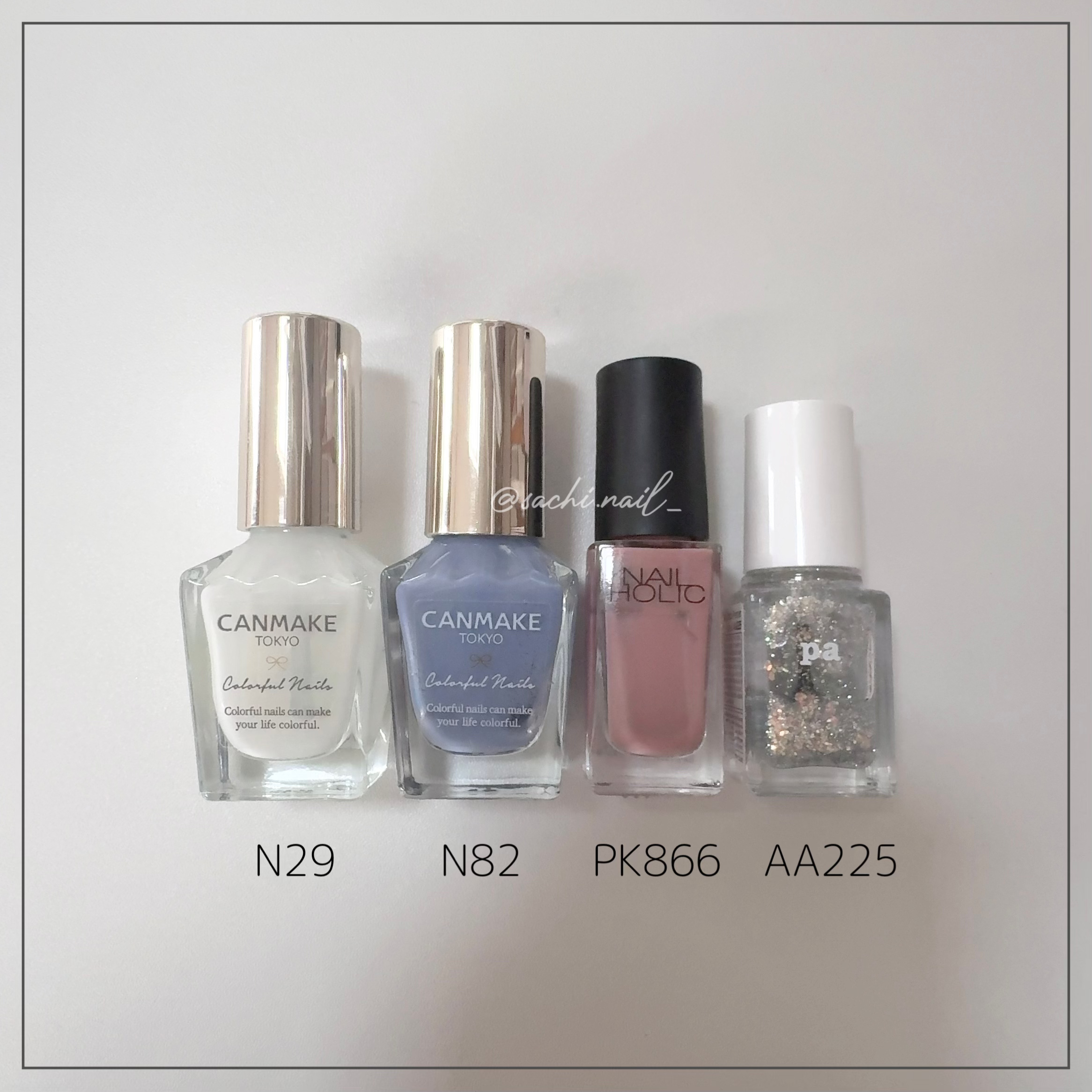 キャンメイクカラフルネイルズ N29ミルクシロップ N82クラウドレススカイ 親指、人差し指、小指は爪先にSV082で細いラインを描き、中指、薬指はAA225を重ねました。 ベースコート、トップコートはネイルホリックのものを使っています。