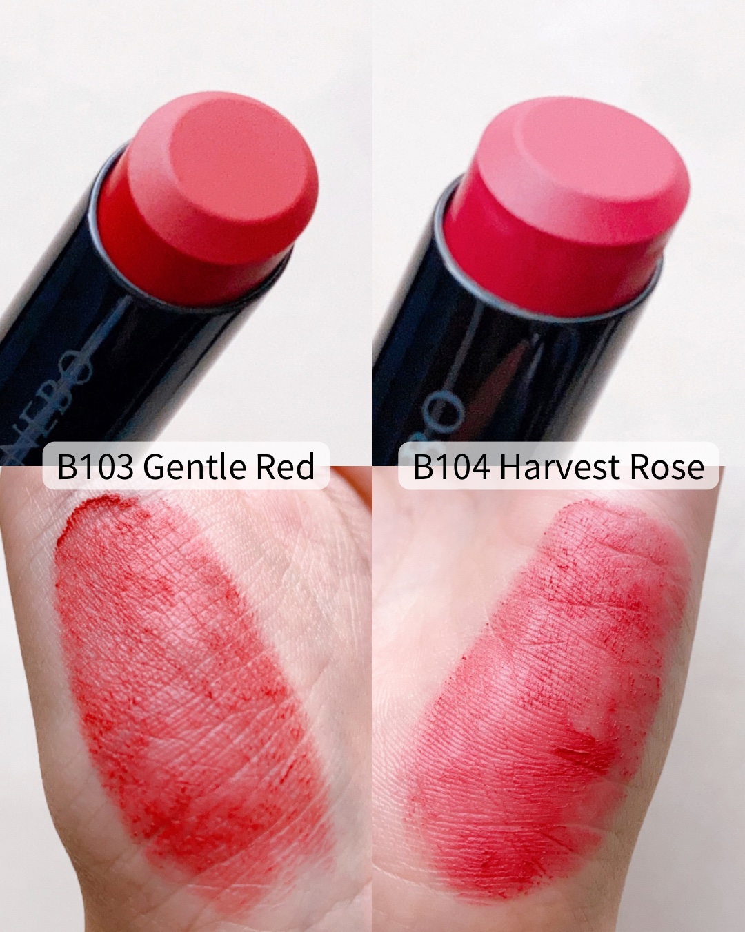 しっとりとしたうるおい感と血色感、柔らかさを感じる仕上がりが特徴のマットリップ。 パウダーとオイルをこだわりのバランスでゲル化し、薄膜でフィットして色持ちも良い🫶🏻 B104は青み寄りの華やかなローズ🌹華やかだけどパキッとしすぎずデイリーに使いやすい◎