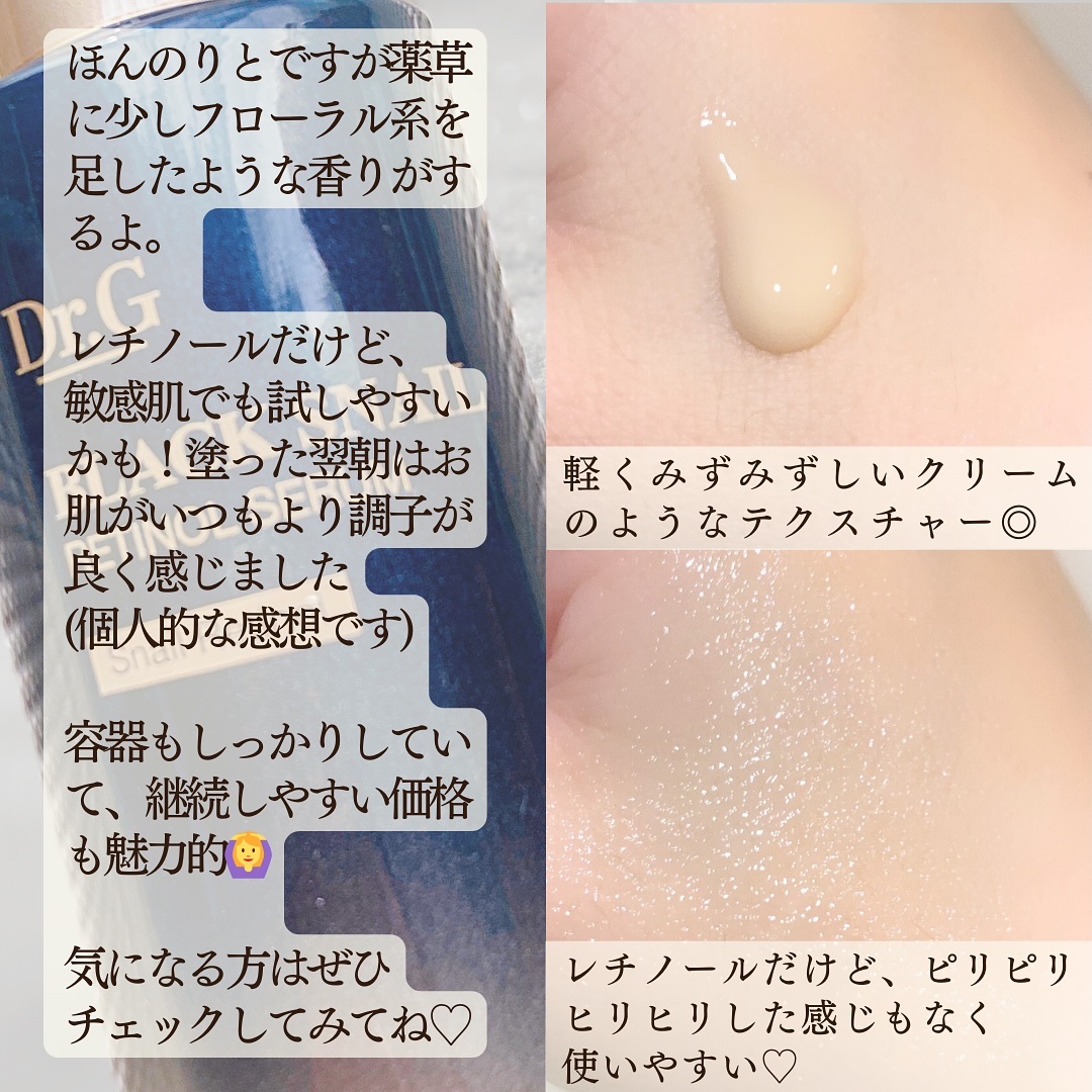 ブラックスネイルと低刺激のレチノールを配合した、肌を6歳若返らせるという美容液! レチノールという成分はコラーゲンの生成を促しますが、刺激的なものが多いけど、Dr.Gのレチノールは独自の成分である、このブラックスネイルレチノールを使っているそう✨️ 肌に高い栄養を与え、肌のキメを整え、弾力やハリのケアを助けるだけでなく、気になる毛穴や小じわなどを改善し、肌のくすみを明るくし、ぷるんっとハリのある肌を作ってくれるそうです☺️♡♡ テクスチャーはさらっとしていて、肌にすっと馴染む感じがGood◎ 使った後は、しっとり感が持続するような使い心地♡