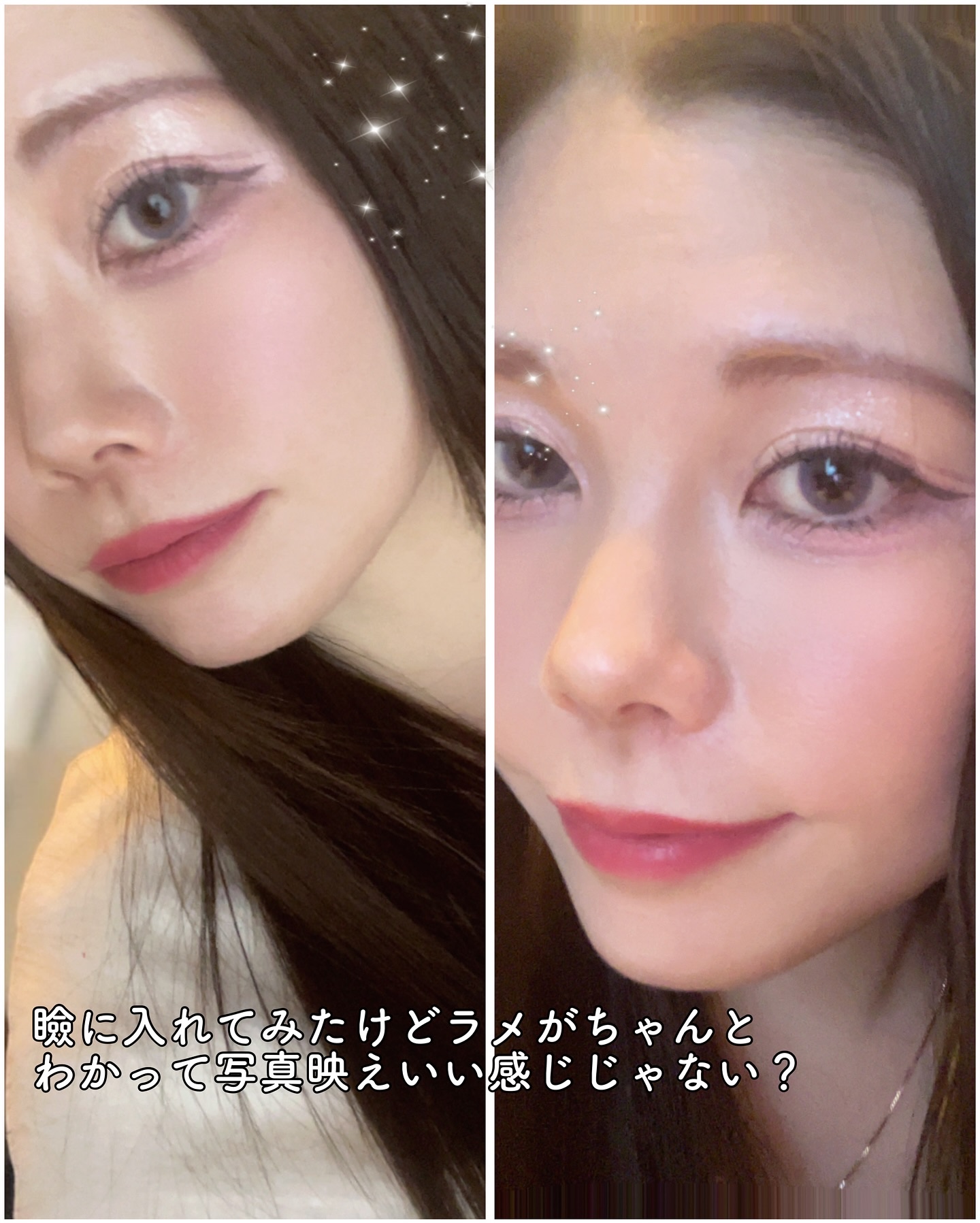 このラメ塗り広げると簡単に小さいラメ、大きいラメがいい感じに塗り広げられます✨ 輝度感が凄く高くて遠くからみてもキラッキラですごい。 わたしが持ってるラメの中で1番大粒なのでメイクにつかってみて新鮮なメイクが出来そうでワクワクしてます(*∩∀∩*)