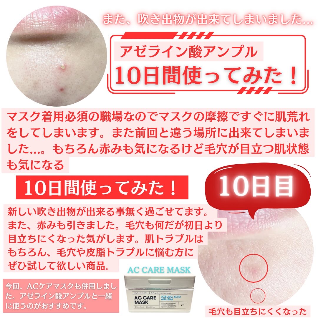 ニキビや皮脂トラブル、毛穴ケアに VTのアゼライン酸がおすすめ アゼライン酸アンプルはさらっとしたテクスチャーで肌なじみが良くベタつきもなし! 使い続けることによってニキビやニキビ跡だけでなく肌のざらつきや日中の皮脂によるテカリも以前より軽減されてきたような気もします