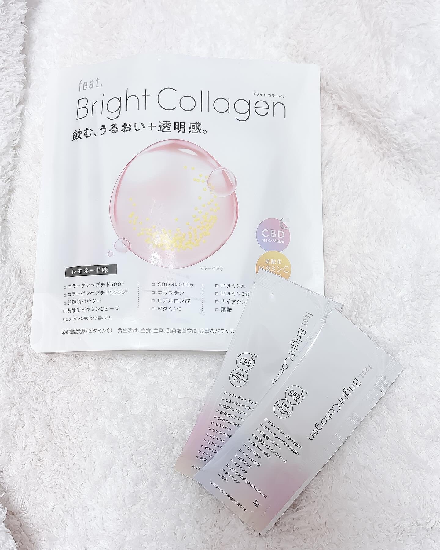 飲む、うるおい+透明感。 ▶feat. Bright Collagen 1日1~2包を目安に粉末のまま飲むか、水に溶かして飲んでください! 個人的には1日2包、水なしで飲んでいます。 レモネード味でほどよい酸っぱさがクセになる! 個包装だから持ち運びがしやすいので、いつでもどこでもキレイ習慣を✨️