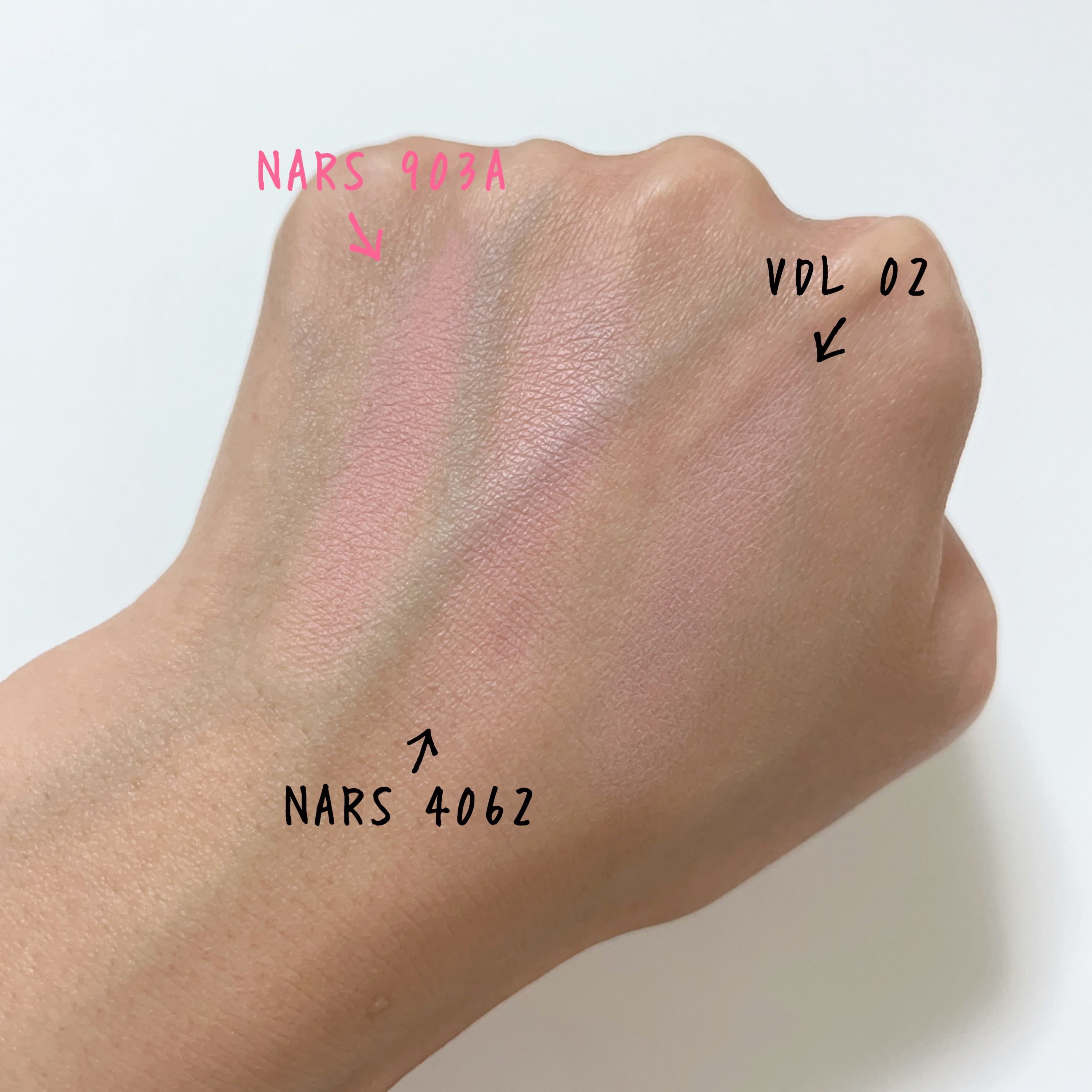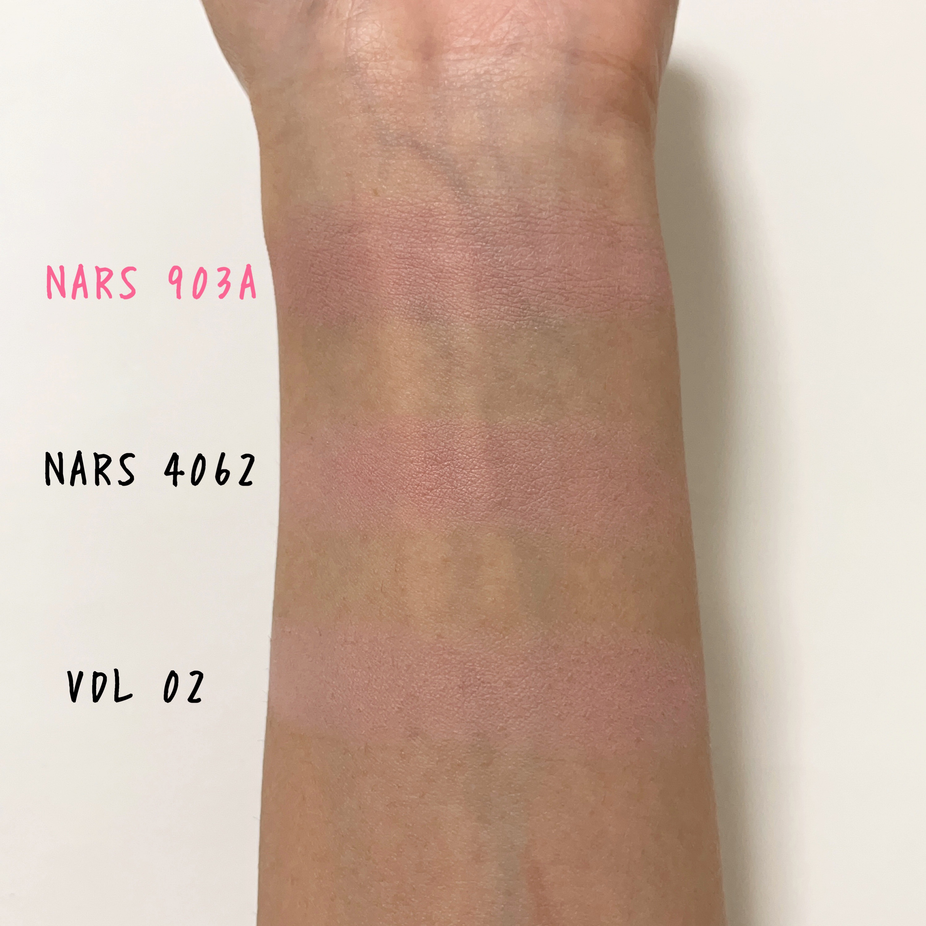 NARS ブラッシュN 905ASEXFANTASY¥5,060○色味・白みを感じる青みピンク。頬にのせると白さは気にならず、やさしい青みピンクに発色。・パレットで見ると落ち着いた色でも、スウォッチではかなり明るめに出る。実際に頬にのせるとパ...