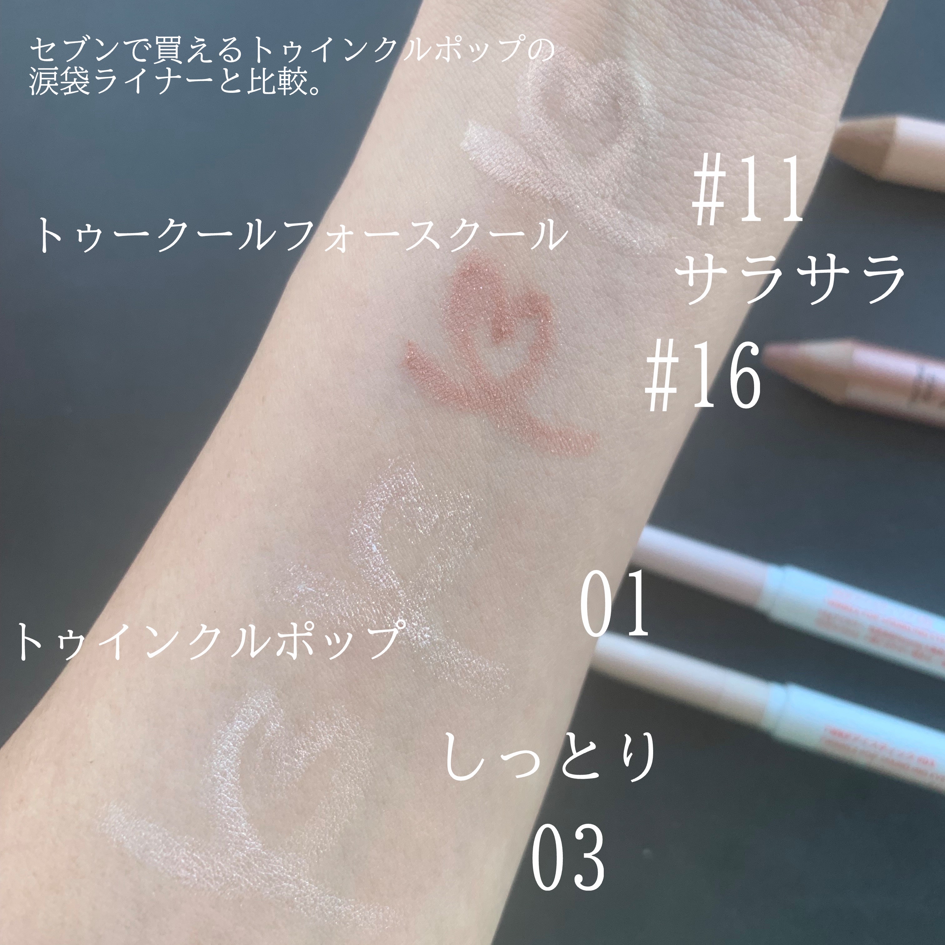 今バズってる涙袋ペンシル!!早速使ってみよう〜♪と思ってまずは手にくるくるしたら…「ポキっ」と根本からがっつり折れてしまいました😭😭😭😭😭💦 付属のシャープナーが早速活躍してくれて改めて使ってみると噂通りめちゃくちゃ可愛くてびっくり♡柔らかいので涙袋にもするする描けるし全然痛くない! 自然な涙袋がかなり可愛くて、涙袋ペンシルの中ではリアルにいちばん好きかも😳かなり気に入ったので、02ロージーデューも購入したいと思いました💕