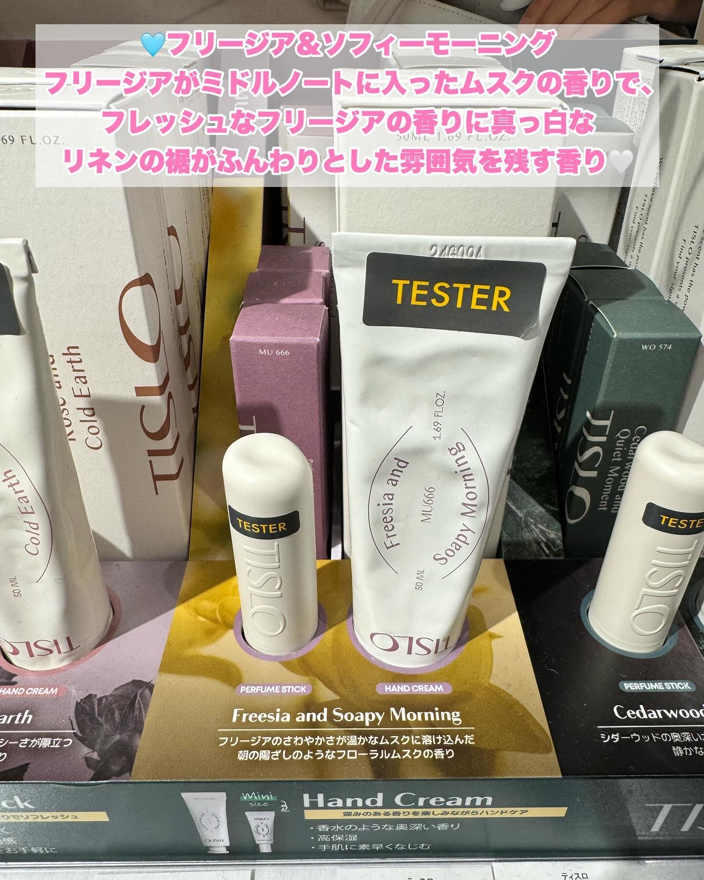 香水のように華やかに香るハンドクリームTISLO!香りが3つあるので、LOFTに嗅ぎに行ってきました。笑 フリージア&ソフィーモーニングにしました!なんというか、一番なじみやすい香りがした! ハンドクリームでも良い香りがほんのり続くので、ふとした時に癒されるー♡