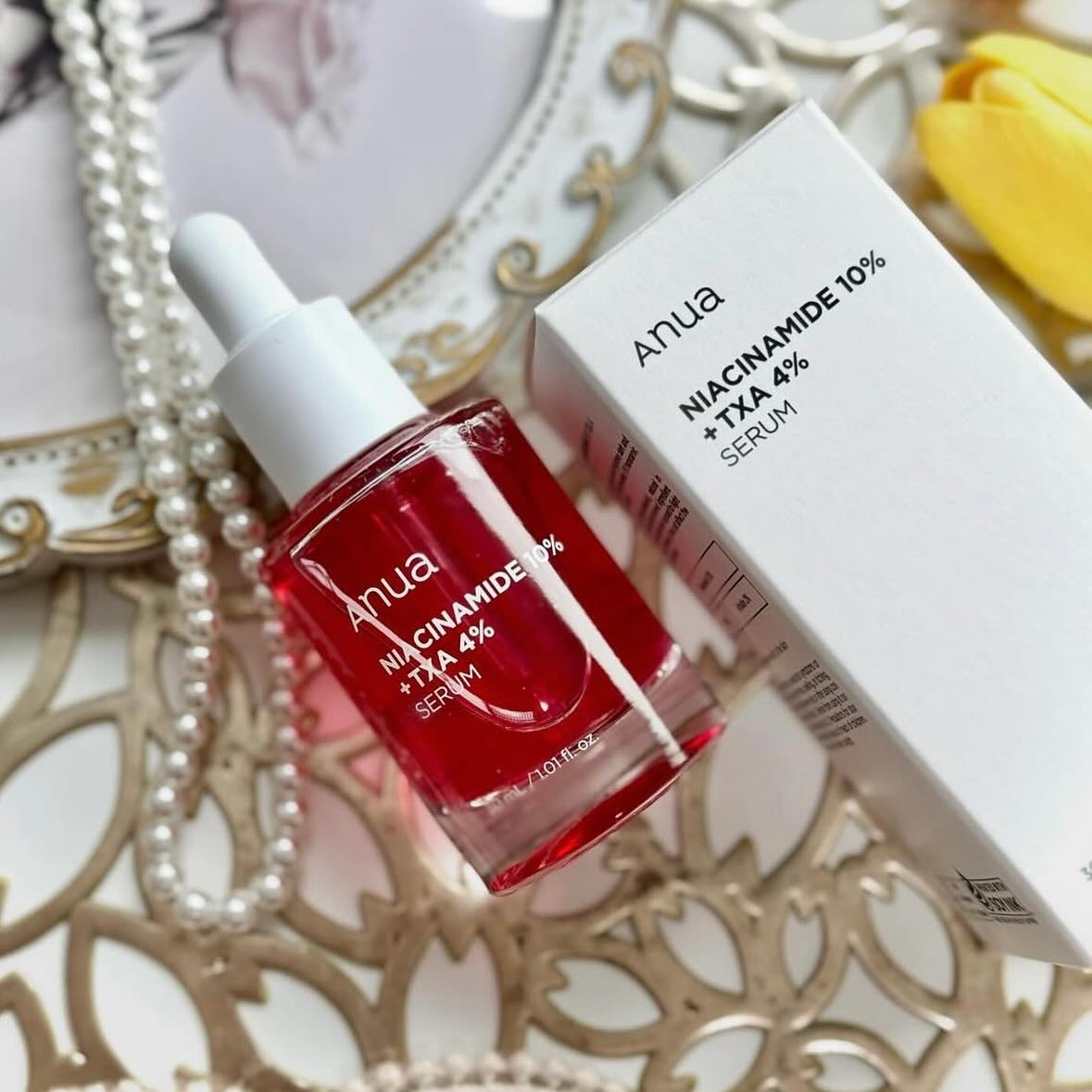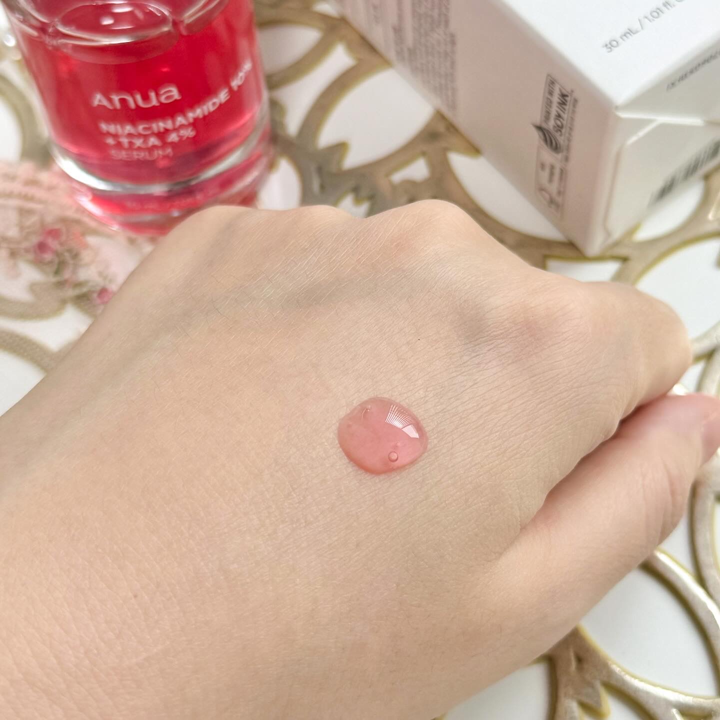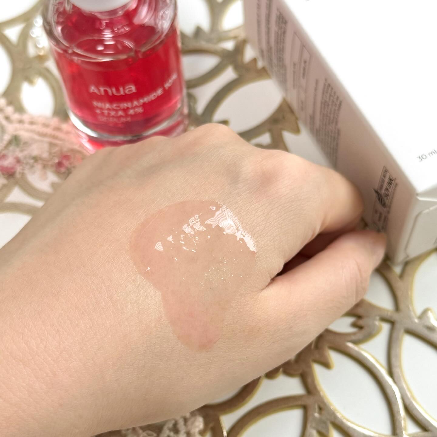 液体が赤ピンクなのが特徴でナイアシンアミド10%、トラネキサム酸4%、アルブチン2%と美白成分が高配合で優れものアイテム🖤 しみとかそばかすとかの色素沈着にアプローチしてくれるから今後の為にもしっかりしよ🥺 さらっとしてて塗りやすいし、朝夕使えるからわたしは化粧前の保湿ケアとしても使ってる!