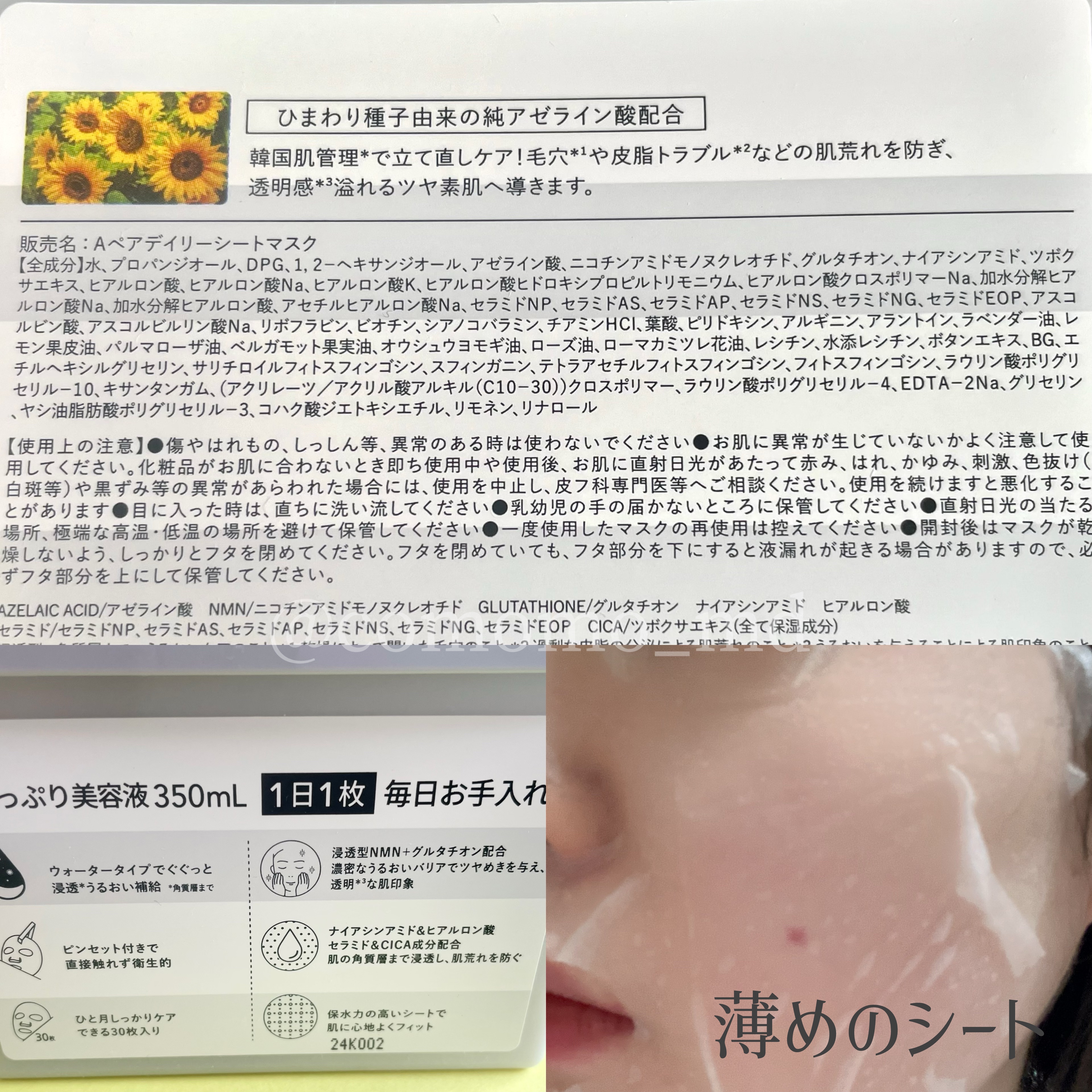 - 毎日のアゼライン酸ケアに! 韓国の肌管理で透明感あふれるツヤ素肌へ アゼペア デイリーシートマスクには純度99%のアゼライン酸、NMN、グルタチオンといった韓国の肌管理で用いられる美容成分に加え、8つのヒアルロン酸、6つのセラミド、ナイアシンアミド、CICAが配合された美容液がたっぷりと使用されています。 シートは薄手で心地よく密着するユーカリ由来の上質なテンセル素材を採用。肌にピタッとフィットして角質層のすみずみまでうるおいを届け、代表的な肌悩みとして知られる毛穴や過剰な皮脂による肌荒れをうるおいでケアします。内側からツヤめくような透明感のあふれる素肌へと整えるシートマスクです。 <不使用成分> アルコール、ミネラルオイル、パラベン、着色料、シリコン アゼライン酸、グルタチオン、ナイアシンアミド:保湿成分、肌管理:うるおいケアのこと、透明感:うるおいを与えることによる肌印象のこと、NMN:ニコチンアミドモノヌクレオチド(保湿成分)、ヒアルロン酸:ヒアルロン酸、ヒアルロン酸Na、ヒアルロン酸K、ヒアルロン酸ヒドロキシプロピルトリモニウム、ヒアルロン酸クロスポリマーNa、加水分解ヒアルロン酸Na、加水分解ヒアルロン酸、アセチルヒアルロン酸Na、セラミド:セラミドNP、セラミドAS、セラミドAP、セラミドNS、セラミドNG、セラミドEOP、CICA:ツボクサエキス(保湿成分)、毛穴:乾燥によって開いた毛穴