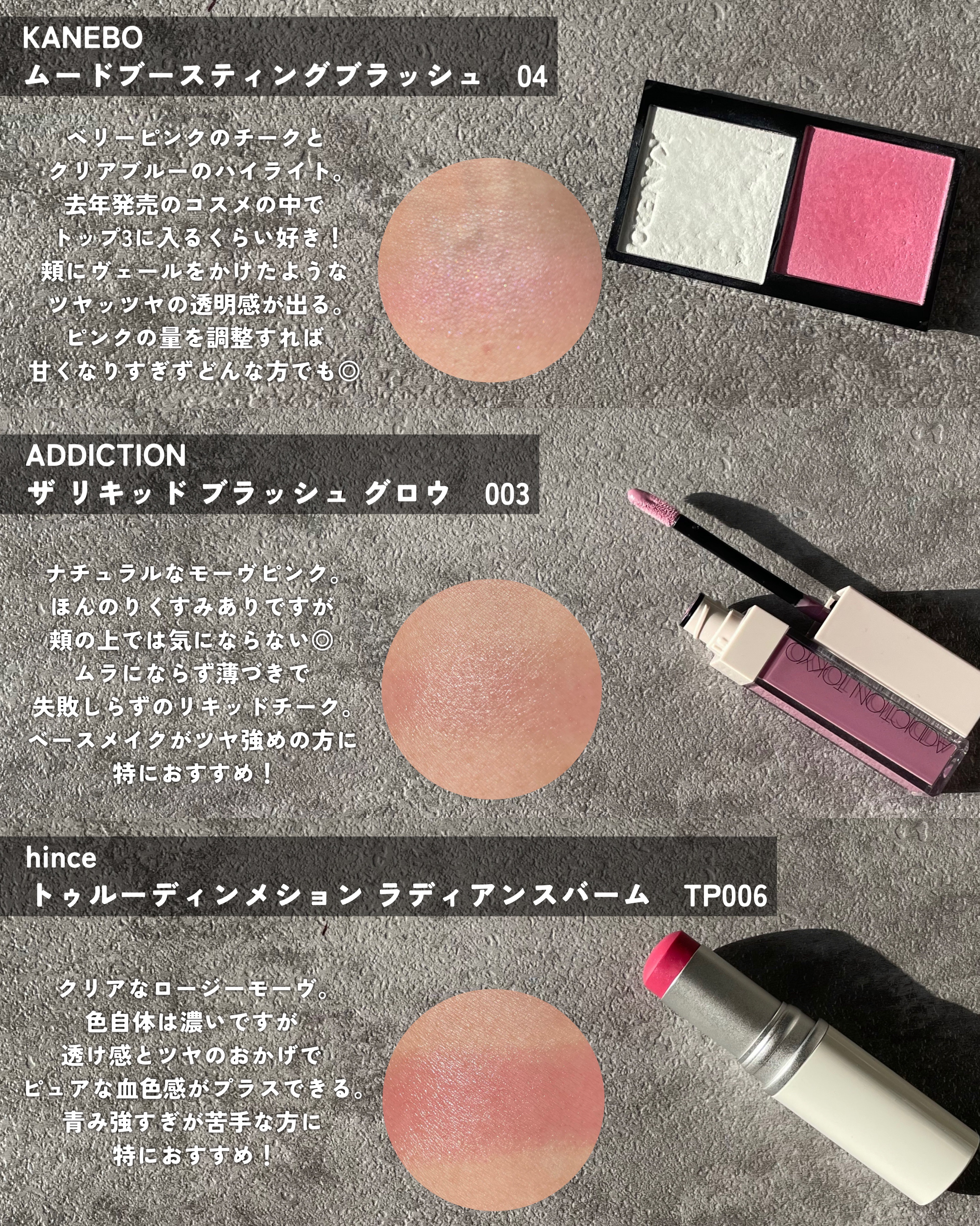 粉質がすごく良くなって、しっとり感とツヤ感が強くなりました! 04が個人的大ヒットで🥹💯 他のチークと混ぜて使うと、ツヤっぽくほわーっとした色付きになって最高! チーク要らない派の方に是非試してみて欲しいカラーです🫶🏻