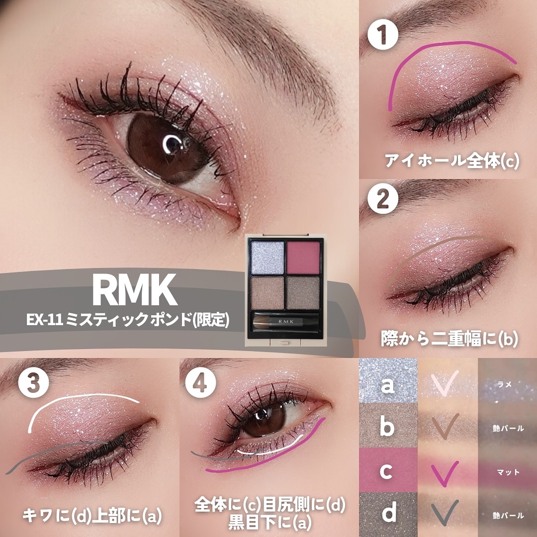 RMK春の限定色EX-11はブルベ優勝カラー💘 透明感のある青ラメに、青みのあるピンクベリー。 特にときめくのが青ラメ。 ラメ感も高くて瞼の上でもキラキラ輝く! 個人的には青みピンクのメイクが気に入った! ブラウンメイクもできるからこのパレットは意外と万能。