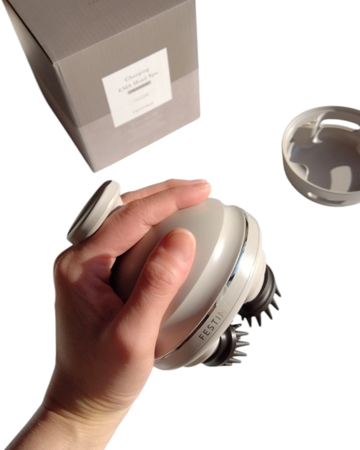 - スパニストの手技の体感をセルフケアで得られるヘッドスパ。頭皮が硬い、顔のエイジングサインに、全身リフレッシュしたい時にも◎ スパニストの手の動きを再現した「極技つまみ上げ」※実用新案取得(実用新案登録第3248422号)は、4つのブラシでつまみ上げながらしっかり頭皮や筋肉を動かすことで、リフトケア*1をかなえます。 2種類のアタッチメントブラシがそれぞれ4個ずつ付属。シリコン製で着脱もカンタン。目的に合わせて使い分けできます。 ●もみブラシ…全身をつまんで動かす(頭・表情リフレッシュ/柔軟にする/肩・デコルテまわりに) ●スパブラシ…地肌の刺激に(頭皮をリフレッシュ/毛穴爽快クレンジング/シャンプーと一緒に) フェスティノのEMSは3段階の刺激レベルを調節可能です。 日常生活では動かしにくい筋肉をEMSで刺激することにより、頭や首、肩などにリフトケア*1しながらアプローチします。 <EMS 使用の際のご注意>EMS は水分を通して電流を流します。使用したい部分を濡らしてご使用ください。 *1:リフトケアとは機器を上に持ち上げながら使用すること