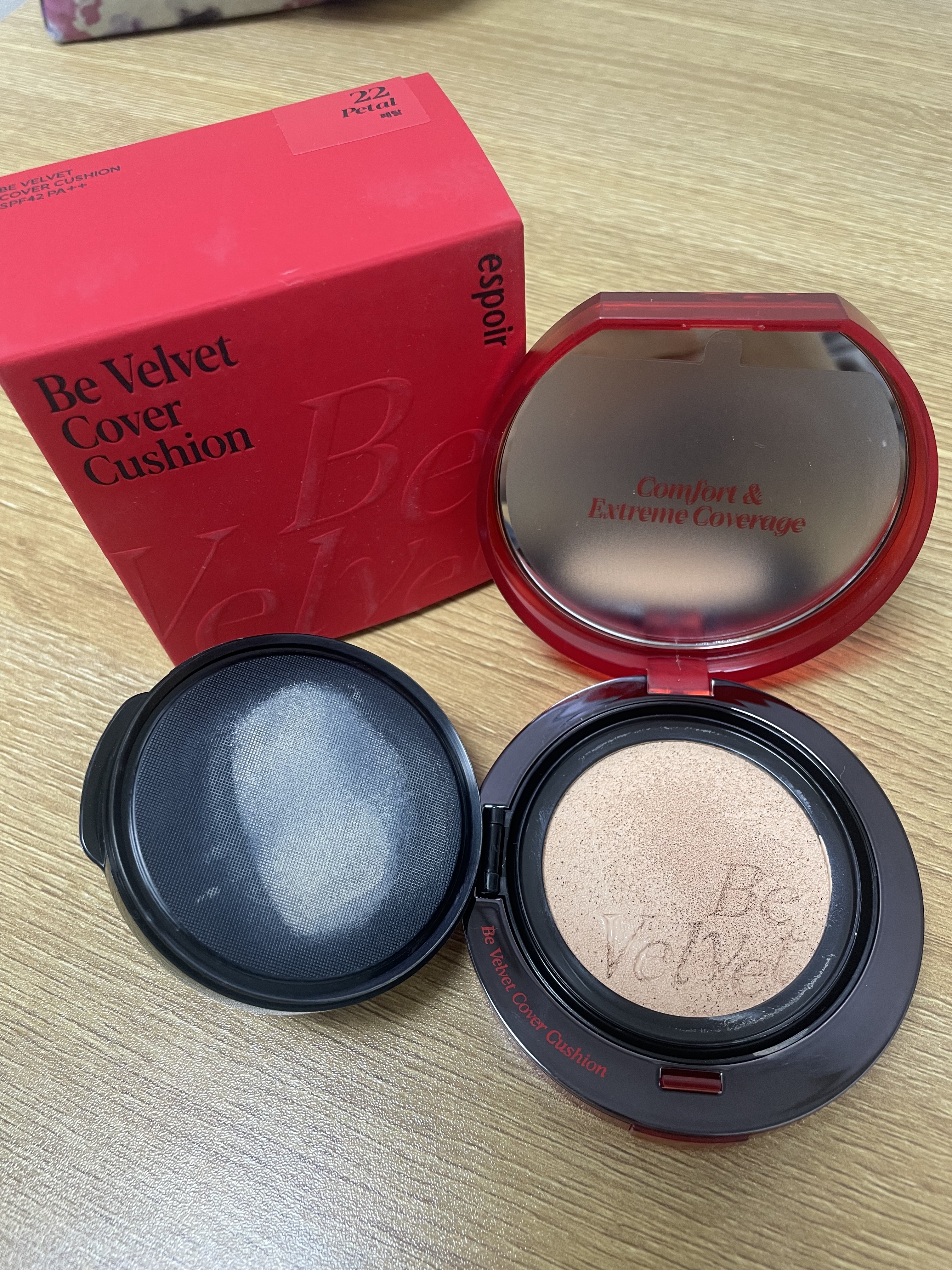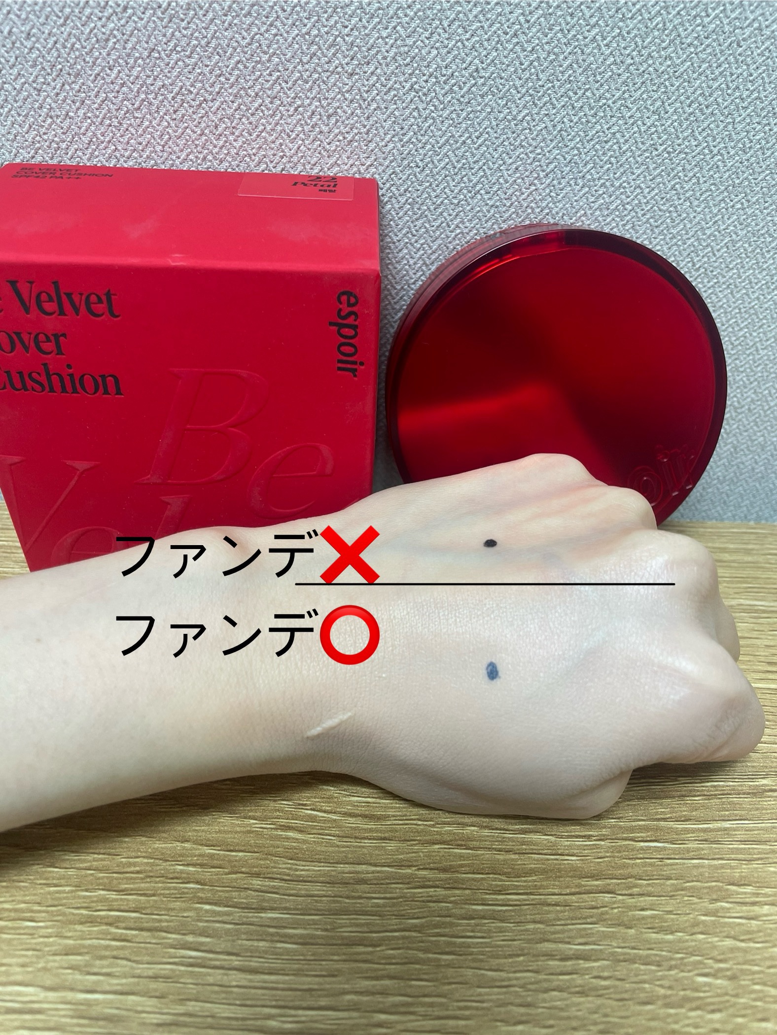 リニューアルしたエスポアのベルベットクッションファンデ! 100時間持続ってー!と思ったけど、カバー力もありつつ、崩れにくい◎ セミマットだから個人的に、ツルツルのゆで卵肌にあんまり慣れない日本人にはちょうどいいかなって感じ◎ 試し塗りで、手首に浮かぶ血管も綺麗に消えてなくなるぐらい、カバー力もあってめっちゃいい♪