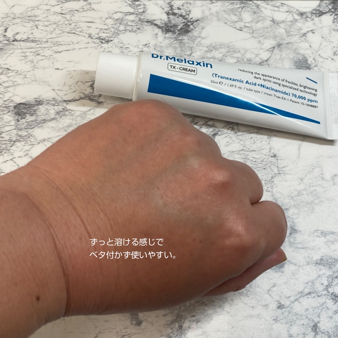 Dr.MelaxinのTXシリーズはシミの飲み薬や注射に使用されるトラネキサム酸配合スキンケア代表作!!! ナノトラネキサム酸でより浸透しやすく べたつかないさらっとテクスチャ一で季節を問わず年中使用できそう◎ クリームにしてはさっぱりした軽めの印象なのでベタつきが苦手の方にはすごくおすすめクリームです☝️