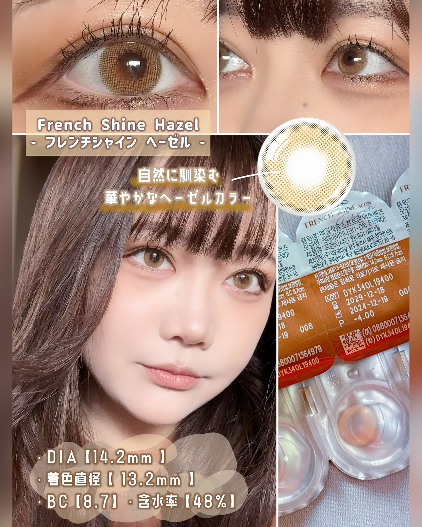- ■OLENS French Shine(オーレンズフレンチシャイン) 韓国カラコン業界の話題のブランド『OLENS(オーレンズ)』の日本正式承認商品シリーズ。世界中から注目を浴びるグループ「NewJeans (ニュージーンズ)」がイメージモデル。そんなOLENSの新シリーズで、華やかに輝きロマンチックな瞳を演出する『FRENCH SHINE(フレンチシャイン)』が、モアコンタクトに新登場! ナチュラルでほのかに甘いゴールドベースのパステルカラーが瞳にほんのり溶け込むように馴染み、やわらかな輝きを生み出します。 着色直径は13.2mmと裸眼に馴染みやすい4色展開で、煌びやかながらもどこかノスタルジックであたたかな瞳を演出します。 ■使い方 コンタクトレンズは高度管理医療機器です。必ず眼科医の処方に従って購入してください。 ■使用上の留意事項 コンタクトレンズは高度管理医療機器です。眼科医の指導に従い装用期間を厳守し、正しくお使いください。眼の定期検査を必ず受けてください。添付文書を必ず読み、取扱方法、装用時間を守って正しくお使いください。少しでも異常を感じたら、直ちに眼科医の検査を受けてください。