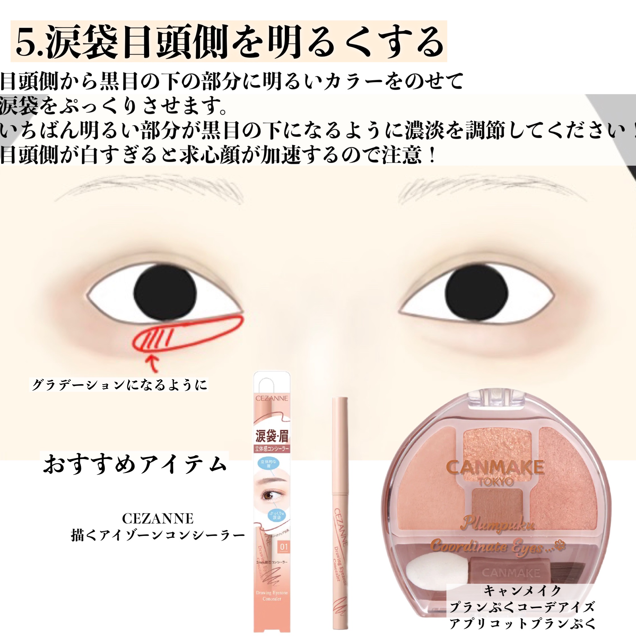 下描きの筆はCANMAKEパーフェクトマルチアイズ付属の物です! 下描きに使ったアイシャドウは同じアイシャドウの04番、右上のベージュカラーです。 影を書く位置の目安は、笑ったときにできる涙袋の中央辺りです! コンシーラーはThe SAEMの1番明るいカラーを使っています。 最後のラメはTooFacedのハイライトを使いました!