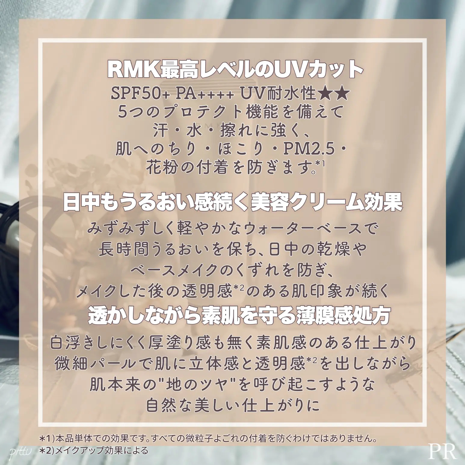 - SPF50+PA++++ çŽ èã®ããããã³ã³ãã£ã·ã§ã³ããããŒã¹ã¡ã€ã¯ã®ä»äžãããé«ãã ããããã«æºã¡ãéææãç¶ãUVãã€ã¯ãªãŒã