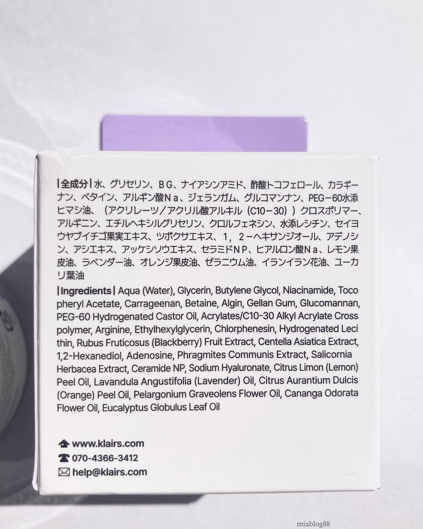 - <90g> 水、グリセリン、BG、ナイアシンアミド、酢酸トコフェロール、カラギーナン、ベタイン、アルギン酸Na、ジェランガム、グルコマンナン、PEG-60水添ヒマシ油、(アクリレーツ/アクリル酸アルキル(C10-30))クロスポリマー、アルギニン、エチルヘキシルグリセリン、クロルフェネシン、水添レシチン、セイヨウヤブイチゴ果実エキス、ツボクサエキス、1,2-ヘキサンジオール、アデノシン、アシエキス、アッケシソウエキス、セラミドNP、ヒアルロン酸Na、レモン果皮油、ラベンダー油、オレンジ果皮油、ゼラニウム油、イランイラン花油、ユーカリ葉油