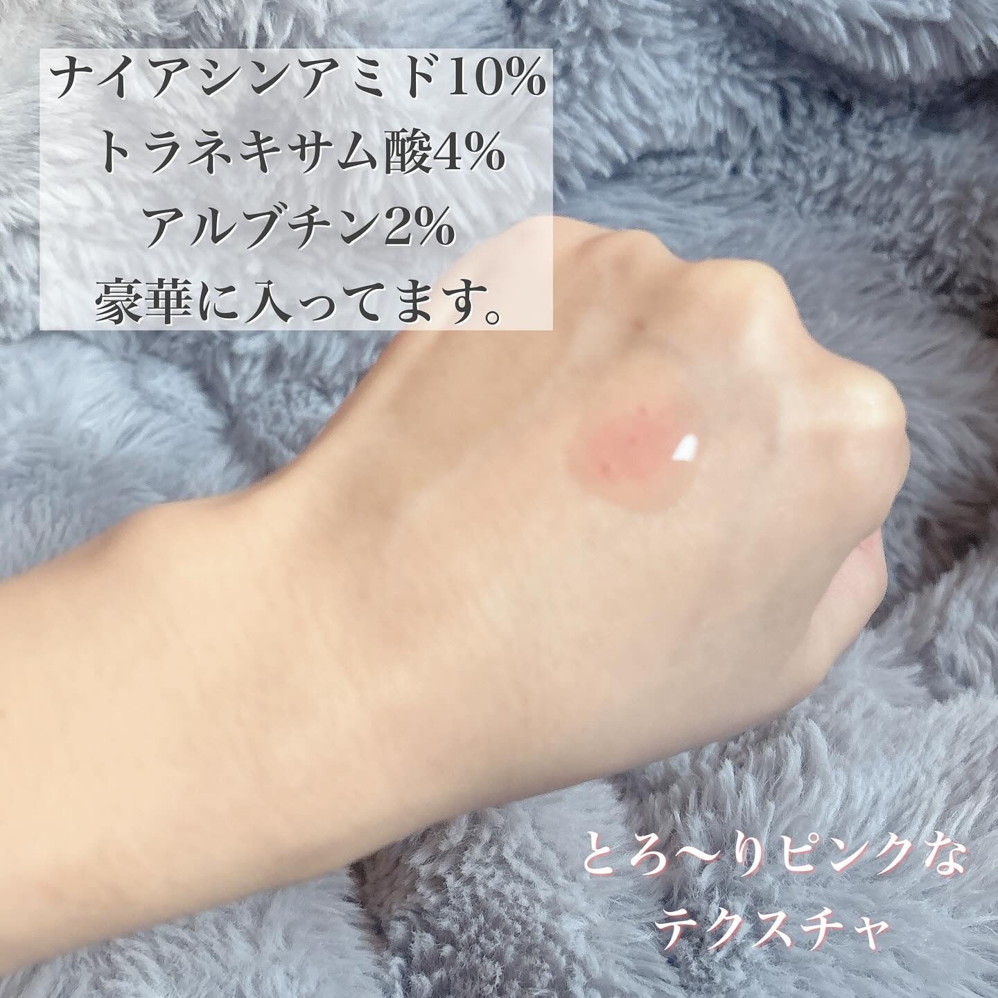 美白、シミの予防で有名な成分である、✔︎ナイアシンアミド 10% ✔︎トラネキサム酸 4% ✔︎アルブチン 2% を贅沢に配合🌿 更に、10種のヒアルロン酸、パンテノール、セラミドなどの保湿成分が、肌のバリア強化やカサカサに乾いた肌に素早く水分チャージ✨ まず色がシロップのような透き通ったピンクでびっくり🥺 とろっとしたテクスチャーで、しっとりもっちりで今の乾燥する時期に高保湿がうれしい😌