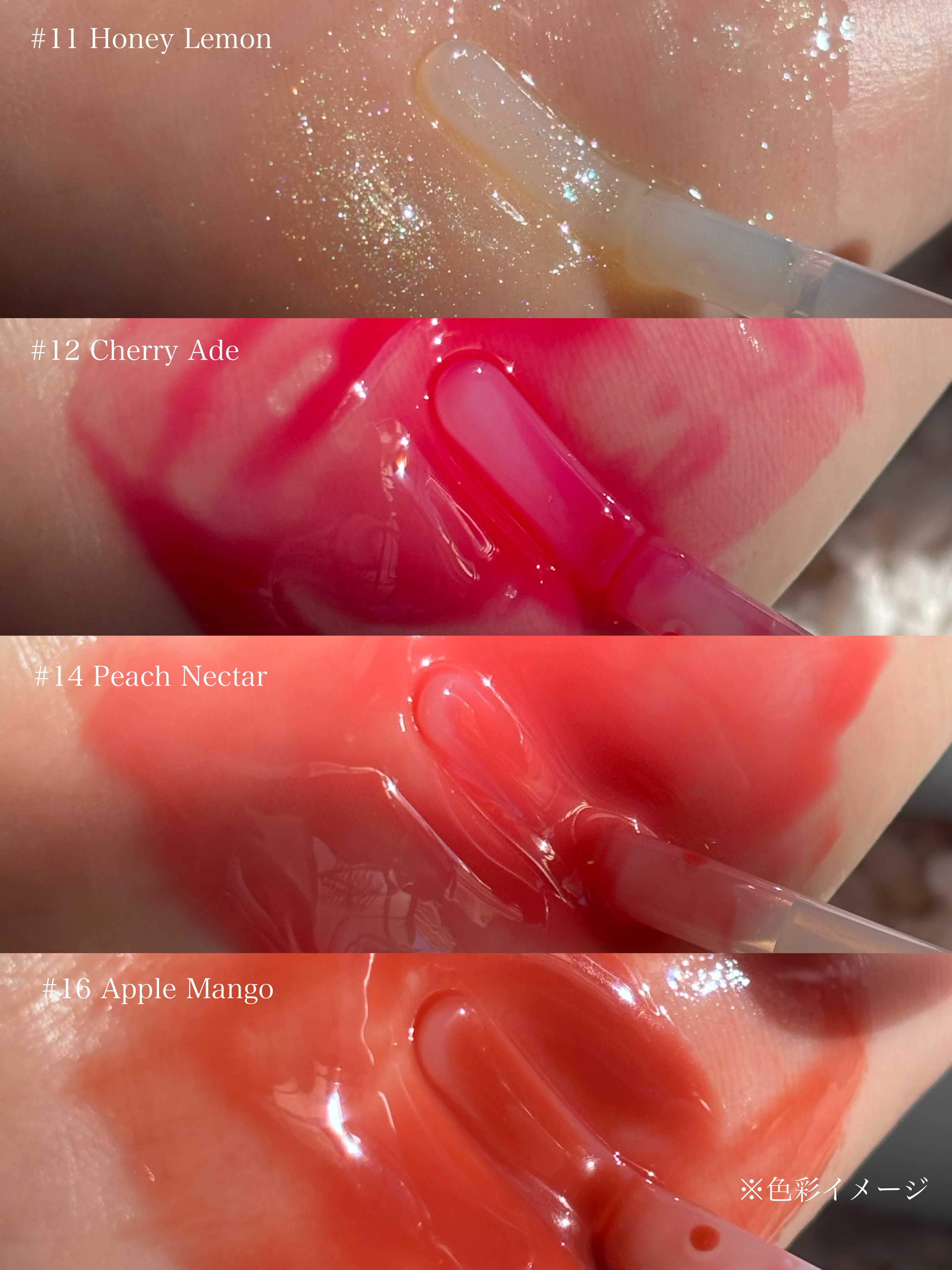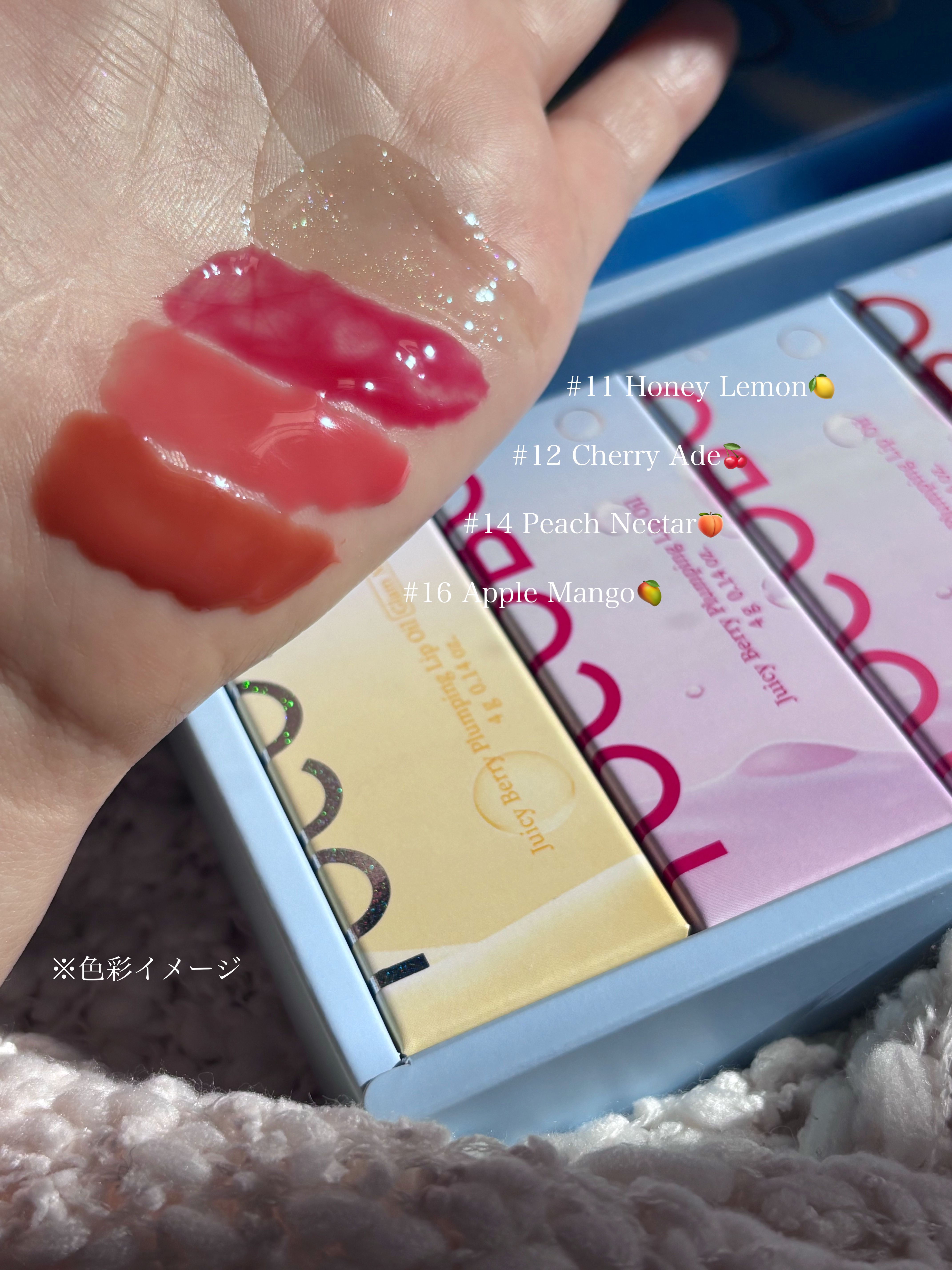 ジューシーベリープランピングリップオイル♡ 3月発売予定で日本限定カラーも登場🍑 ぷるぷるのビー玉リップ✨️ - 11ハニーレモン:ラメ入りで可愛い🍋 プランピングMAXタイプ 慣れるまで結構痛い😣 1番透け感のないタイプで、ぷるんと桃唇に✨️ - 16アップルマンゴー:こちらも3月発売予定の日本限定カラー🥭