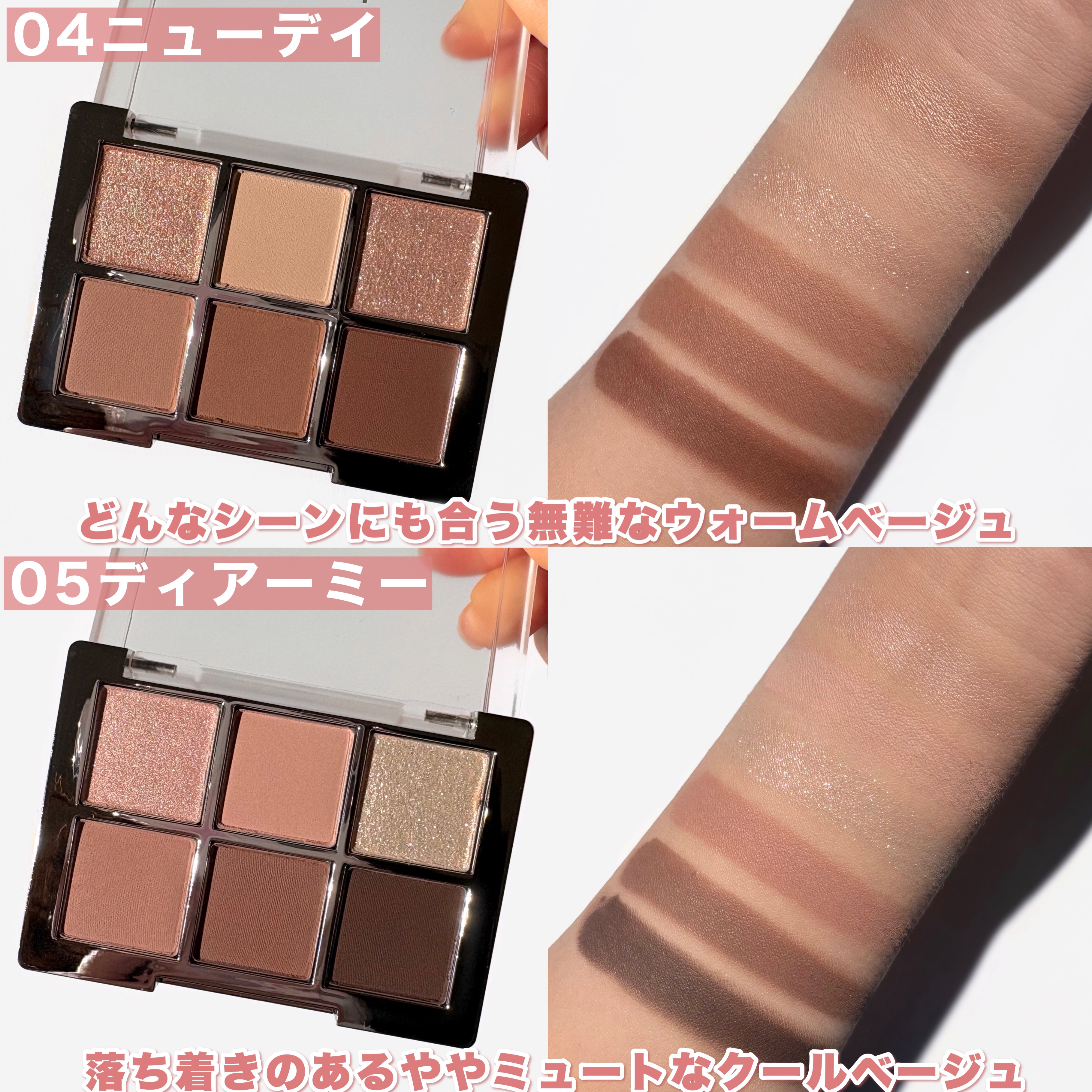 粉がサラーっとしていて、まぶたに密着してくれます!薄めのカラーも割と発色してくれる♡ 陰影の付けやすさに感動🥺マット、シマー、グリッターの組み合わせで繊細な目元に💕 私のお気に入りは02フェアリーと05ディアーミー❤️