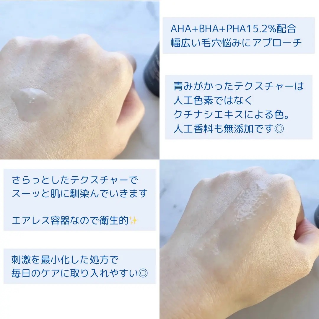 ピーリング成分のAHA、BHA、PHAが15.2%入ってるとのことで、期待大🫶 この色は着色料じゃなくて、自然由来成分のクチナシエキスの色なんだって🦋 塗るとほっぺが手に吸い付くもっちもち肌になる🙂↕️🩵