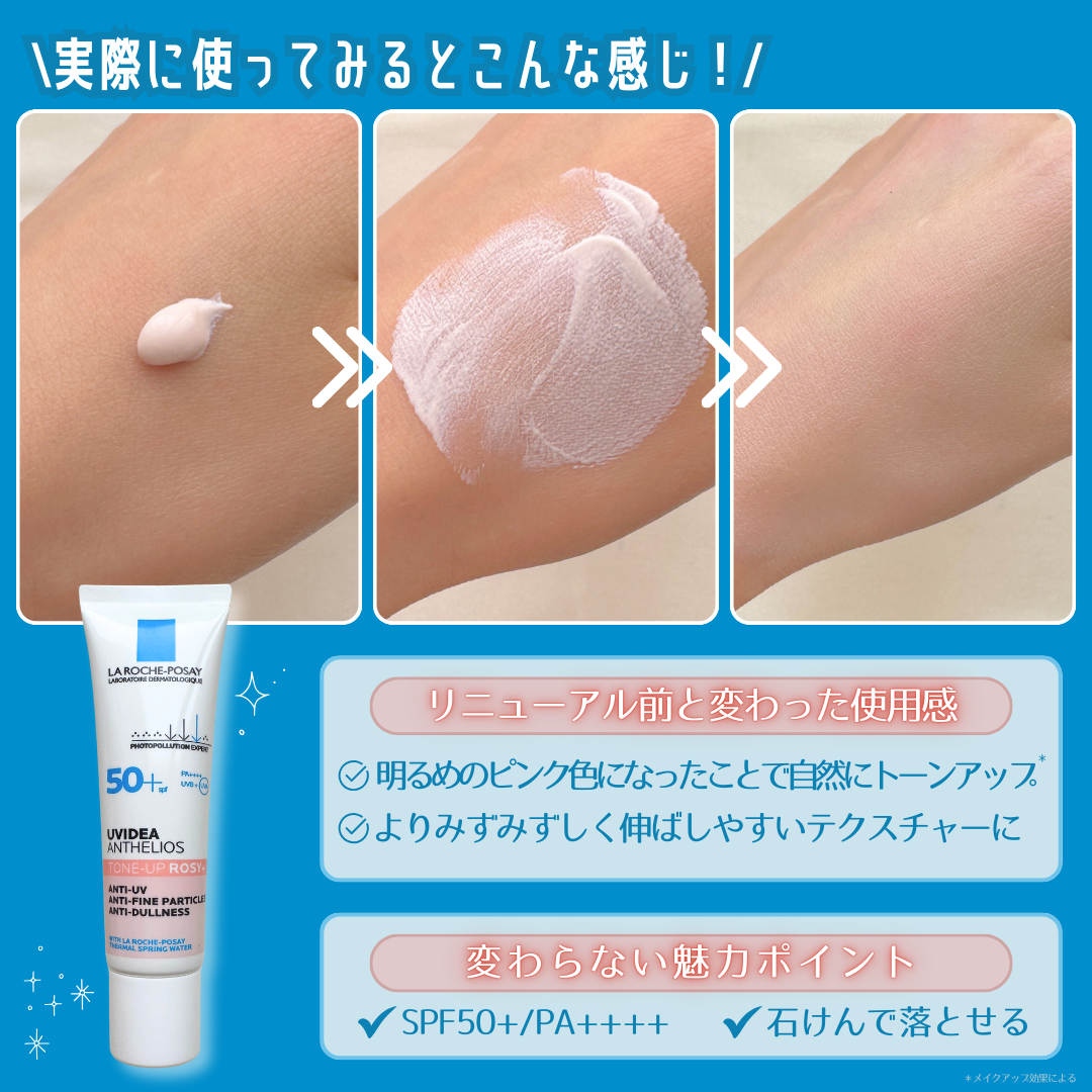 - 敏感肌用スキンケアUV No.1*が、 皮膚科学にも基づいてさらに進化。トーンアップUV ローズ+ 全部、はね返す 。 光、くすみ*1、紫外線も。 生ツヤ肌トーンアップ*2UV ●光の美しい反射に、新 グロウピンク設計 反射力アップ*2 + 黄ぐすみ補正*2 なめらかなツヤ肌*2に。 ●日中くすみ*1リスクに、新 スキンケア膜日焼け止め 整肌成分:ビタミンC誘導体*3 + ビタミンE *4 配合 なめらかケア成分:LHA *5 配合 塗るたび肌が整い、明るくつるんとした肌印象に。 ●紫外線対策に、新 UVフィルター設計*6 SPF50+・PA++++ 8種*6のフィルターで、ロングUVAを含む紫外線をしっかり防御。 ●皮膚科医の協力のもとテスト済み*7 ●ニキビのもとになりにくい処方*8 ●アジア人の敏感な肌でテスト済み*7 ●花粉など外的刺激から肌を守る ●石けん・洗顔料でオフ ●無香料 ●パラベンフリー *1 乾燥による *2 メイクアップ効果による。 *3 アスコルビルグルコシド(製品の抗酸化剤・整肌成分) *4 トコフェロール(製品の抗酸化剤・整肌成分) *5 カプリロイルサリチル酸(角質柔軟成分) *6 酸化チタン(紫外線散乱剤)、エチルヘキシルトリアゾン、ビスエチルヘキシルオキシフェノールメトキシフェニルトリアジン、t-ブチルメトキシジベンゾイルメタン、テレフタリリデンジカンフルスルホン酸、フェニルベンズイミダゾールスルホン酸、ドロメトリゾールトリシロキサン、ジエチルアミノヒドロキシベンゾイル安息香酸ヘキシル(全て、紫外線吸収剤) *7 すべての人に肌トラブルがおきないわけではありません。 *8 すべての人にニキビのもとができないわけではありません。
