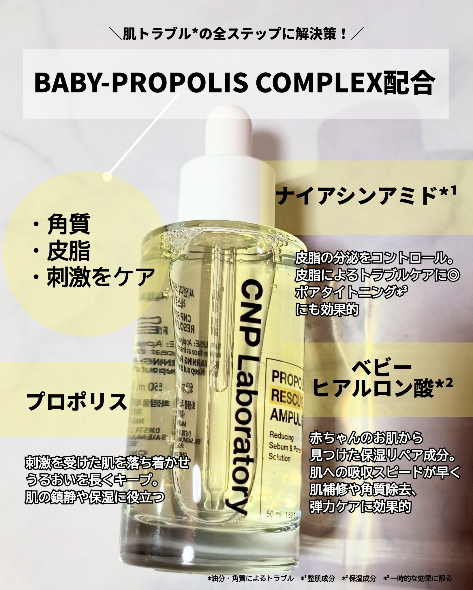 - 整肌作用に特化したプロポリスで保湿・毛穴ケア・皮脂ケア・肌荒れ予防まで乾燥によるお肌の悩みをすべてケア ・整肌成分プロポリス・ナイアシンアミド・保湿成分ベビーヒアルロン酸配合により、整肌や肌荒れ予防においてソリューションを提供するレスキューアンプル ・IP-BHA成分により皮脂ケア(角質ケア成分) ・4種の整肌成分による肌荒れ予防 ・皮脂バランスを整える ・乾燥や皮脂により毛穴が目立つ肌のケア ・乾燥などの外部刺激により敏感になったお肌を素早く整肌ケア