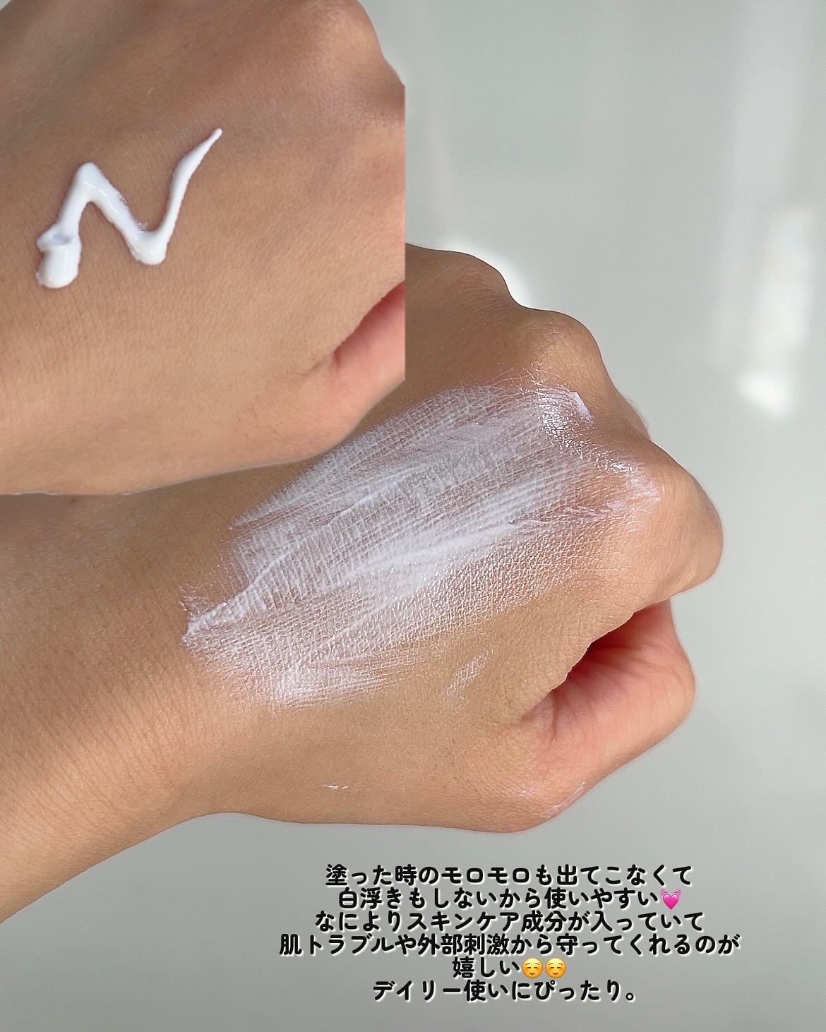 肌への負担は少なく 焼かない日焼け止めとして人気です ピーチベースなので、自然に肌をトーンアップさせてくれる化粧下地としても使える日焼け止めです🧏🏼♀️ 無機系(紫外線散乱剤)の日焼け止めなので肌で光を跳ね返し紫外線が肌に吸収しにくく 塗った瞬間から紫外線を反射してくれます スキンケア成分もたくさん起合しておりツボクサやドクダミは、肌の温度を下げるので肌荒れや肌トラブルを抑え 敏感な肌を外部の刺激から守ります☀️