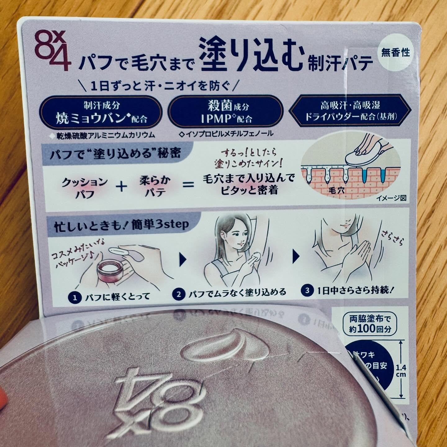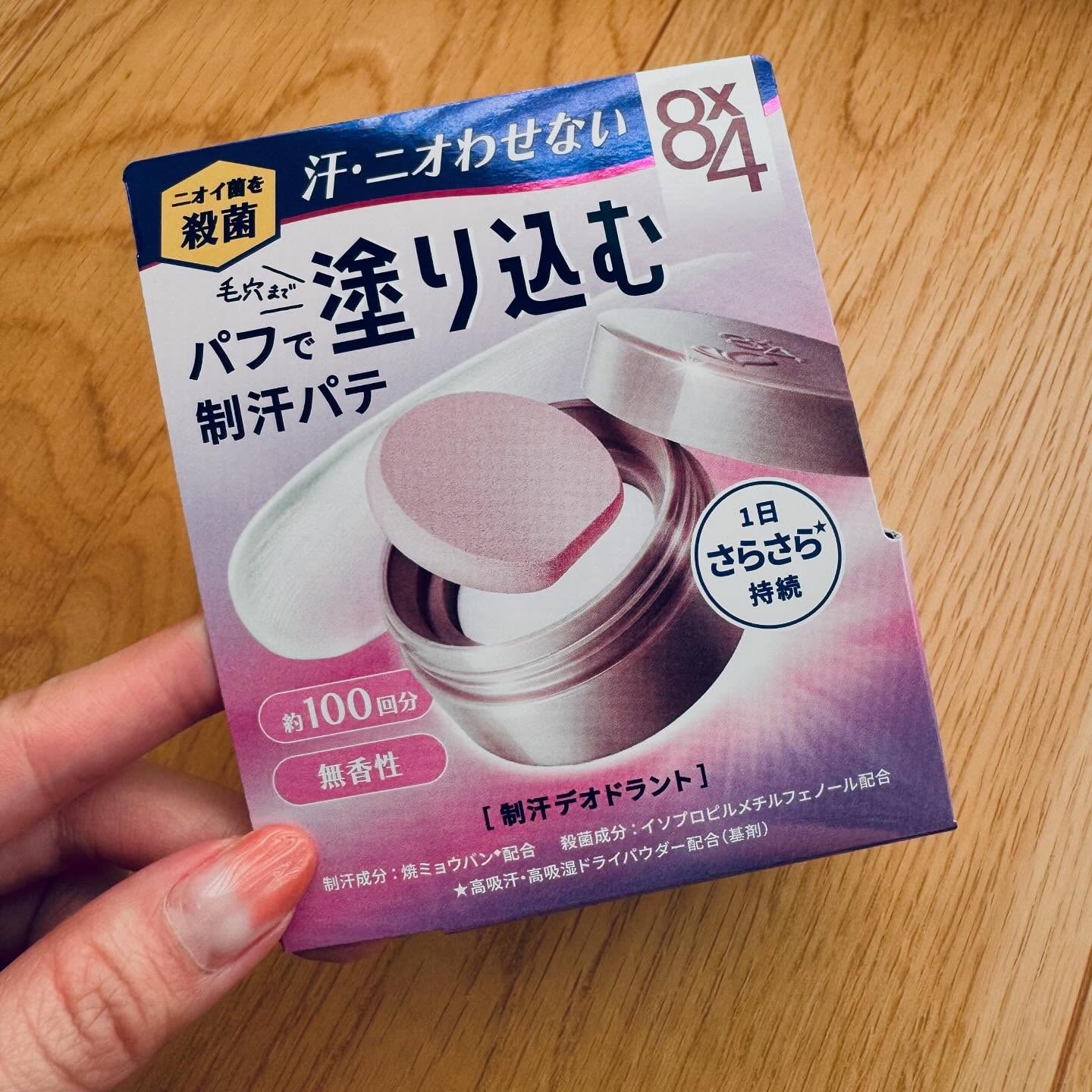新タイプの制汗デオドランド剤をつかってみました〜なんとパフで“塗り込む”制汗パテです✨ 8x4最高のさらさら感を実現し、汗が気になる時でも1日ずっとさらさらが持続、また、殺菌成分が汗のニオイの元となるニオイ菌を殺菌して1日ずっと汗ニオわせません。 パフで塗り込むだけなので、ワキ以外にも額やデコルテ、首などいろいろな身体の気になる箇所につかっていきたいと思います。