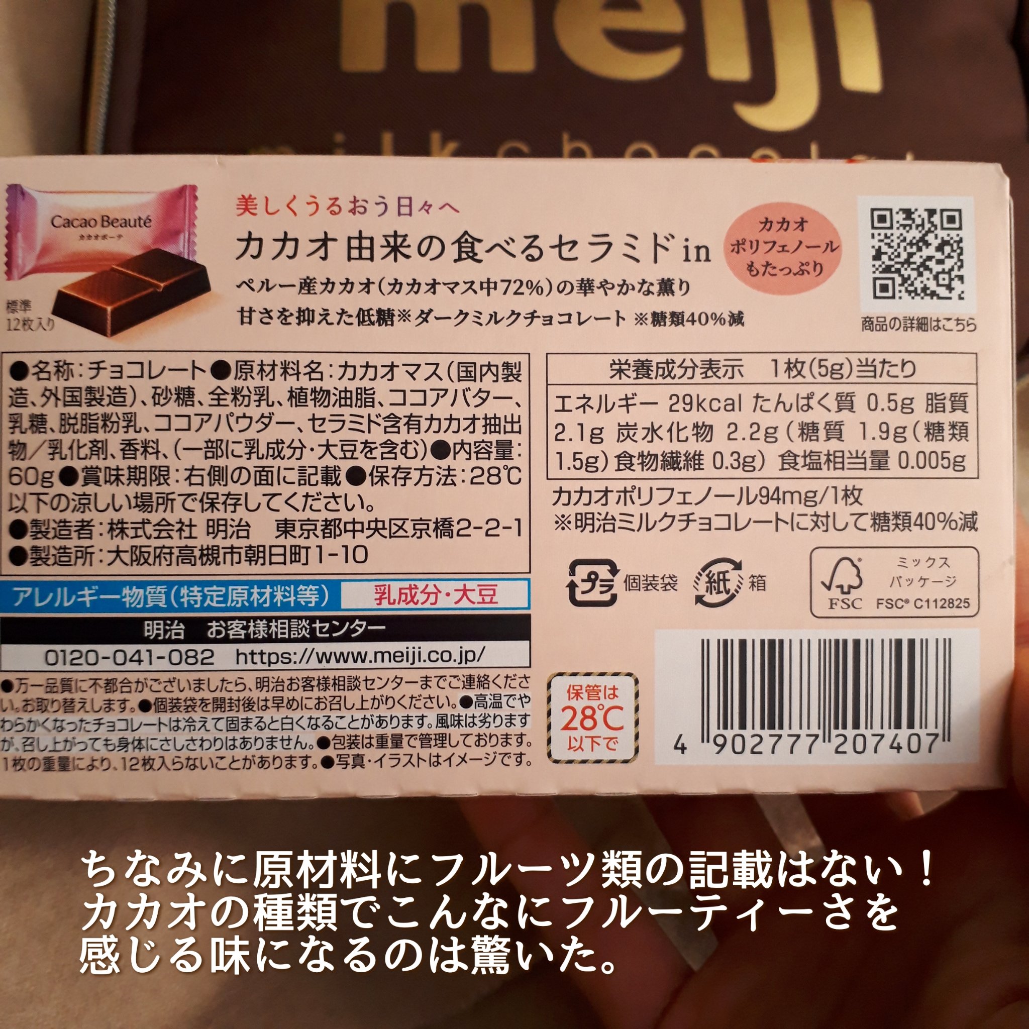 おいしく美しくご自愛チョコレート🤎 カカオセラミド(セラミド含有カカオ抽出物150mg配合)カカオポリフェノール(94mg配合)食物繊維、ミネラルなどおいしく美容に嬉しい成分を摂取できます。 甘さは控えめでほんのり酸味と紅茶の様な香りも感じます🤎