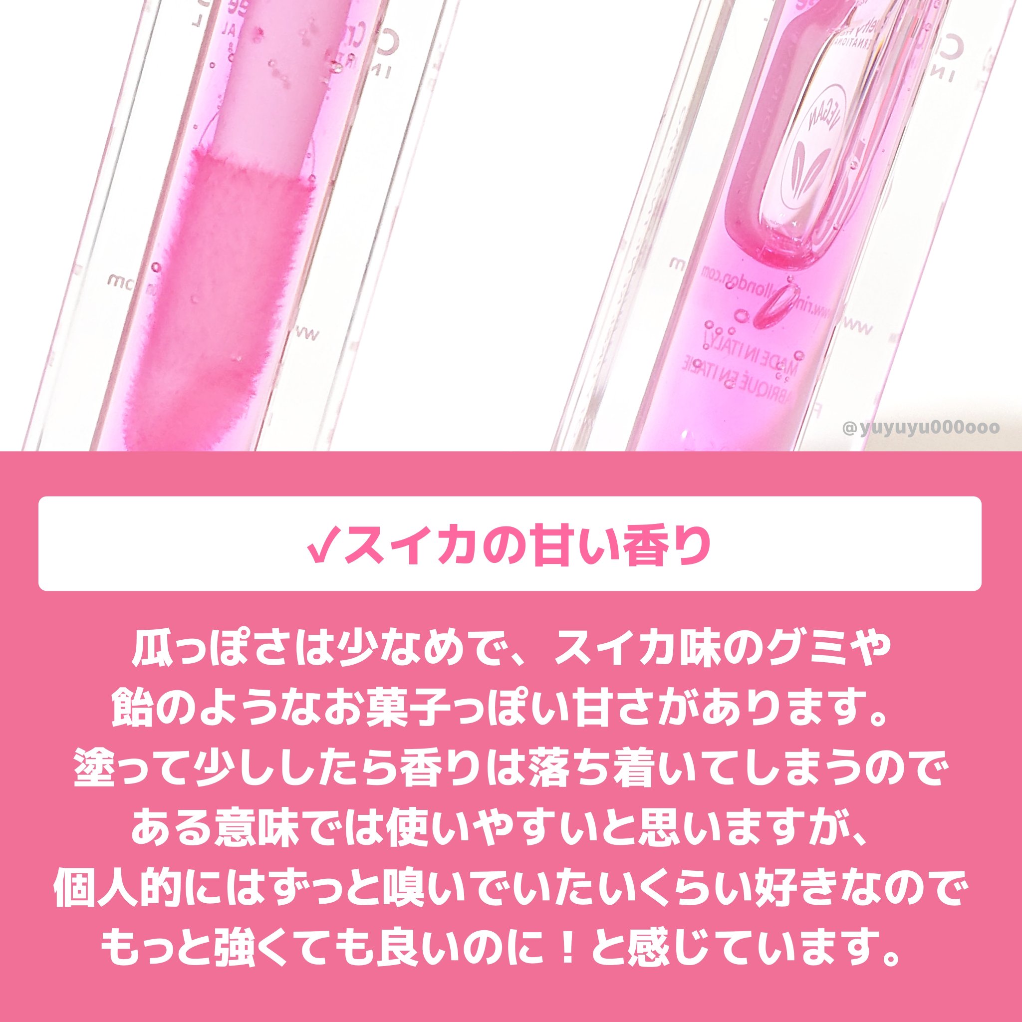 リンメルのリップオイル、ちゅるん唇が演出できるの💗 むっちり厚みのあるテクスチャー💭でもベタッとしすぎないところが好き👏🏻愛用中の01はスイカの香りでほんのりピンク発色!!!🍉 チップも大きめで塗りやすくて最高です🥹💗👏🏻