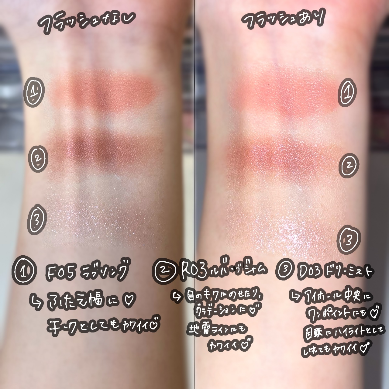 - 【全成分表示】 タルク、トリエチルヘキサノイン、リンゴ酸ジイソステアリル、イソステアリン酸水添ヒマシ油、ポリグリセリル-3ポリジメチルシロキシエチルジメチコン、ラウリン酸亜鉛、スクワラン、トコフェロール、メチルパラベン、(+/-)グンジョウ、シリカ、ホウケイ酸(Ca/Al)、マイカ、金、銀、酸化スズ、酸化チタン、酸化鉄、赤226" 【R01~R06共通】 タルク、トリエチルヘキサノイン、リンゴ酸ジイソステアリル、イソステアリン酸水添ヒマシ油、ポリグリセリル-3ポリジメチルシロキシエチルジメチコン、ラウリン酸亜鉛、スクワラン、トコフェロール、メチルパラベン、(+/-)グンジョウ、シリカ、ホウケイ酸(Ca/Al)、マイカ、酸化スズ、酸化チタン、酸化鉄、赤202、赤226" 【D01~D04共通】 ジメチコン、リンゴ酸ジイソステアリル、タルク、アルキル(C26-28)ジメチコン、(ジメチコン/ビニルジメチコン)クロスポリマー、スクワラン、カルナウバロウ、PEG-10ジメチコン、ポリメタクリル酸メチル、(+/-)グンジョウ、コンジョウ、ホウケイ酸(Ca/Al)、マイカ、酸化チタン、酸化鉄、水酸化Al" 【F01~F06共通】 ジメチコン、アルキル(C26-28)ジメチコン、(ジメチコン/ビニルジメチコン)クロスポリマー、リンゴ酸ジイソステアリル、スクワラン、PEG-10ジメチコン、ポリメタクリル酸メチル、カルナウバロウ、(+/-)グンジョウ、マイカ、黄4、酸化チタン、酸化鉄、水酸化Al、赤226" 【G01~G04共通】 タルク、合成フルオロフロゴパイト、トリエチルヘキサノイン、リンゴ酸ジイソステアリル、イソステアリン酸水添ヒマシ油、スクワラン、トコフェロール、ラウリン酸亜鉛、メチルパラベン、(+/-)マイカ、酸化チタン、酸化鉄、赤226