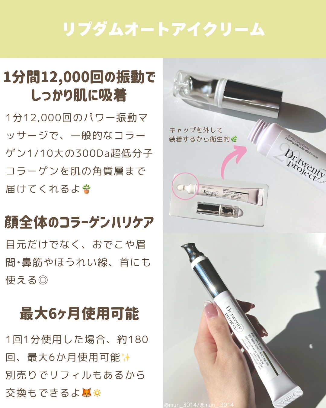 #PRDr.twentyProject@dr20project_jpリプダムオートアイクリーム1分間に12,000回のマイクロ音波振動で繊細な目元を集中ケア🤍目元やほうれい線、首など顔全体に使えるよ◎ぷるぷる震えながらケアするクリームがとても...