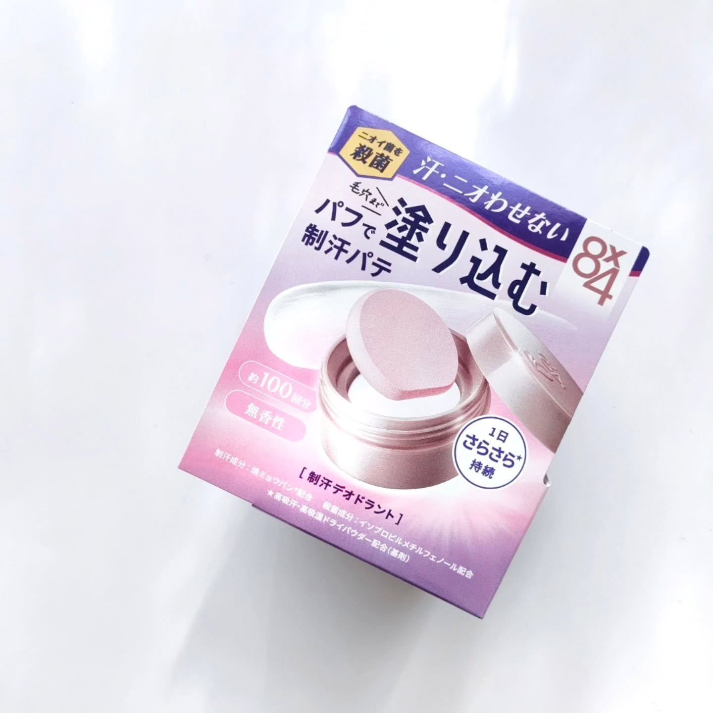 一日ずっと汗・ニオイを防ぐ 汗・ニオイに悩んでいる方に向け、ワキなど汗・ニオイが気になる箇所に、クッションパフで柔らかい「パテ」を塗り込むことで、毛穴まで入り込んでピタッと密着する、新タイプの制汗デオドランド剤が登場。 8x4最高のさらさら感を実現し、汗が気になる時でも1日ずっとさらさらが持続、また、殺菌成分が汗のニオイの元となるニオイ菌を殺菌して1日ずっと汗ニオわせません。 弾力のある専用のクッションパフで柔らかいパテを塗り込むことで、ムラなく塗れて毛穴までピタッと密着します。