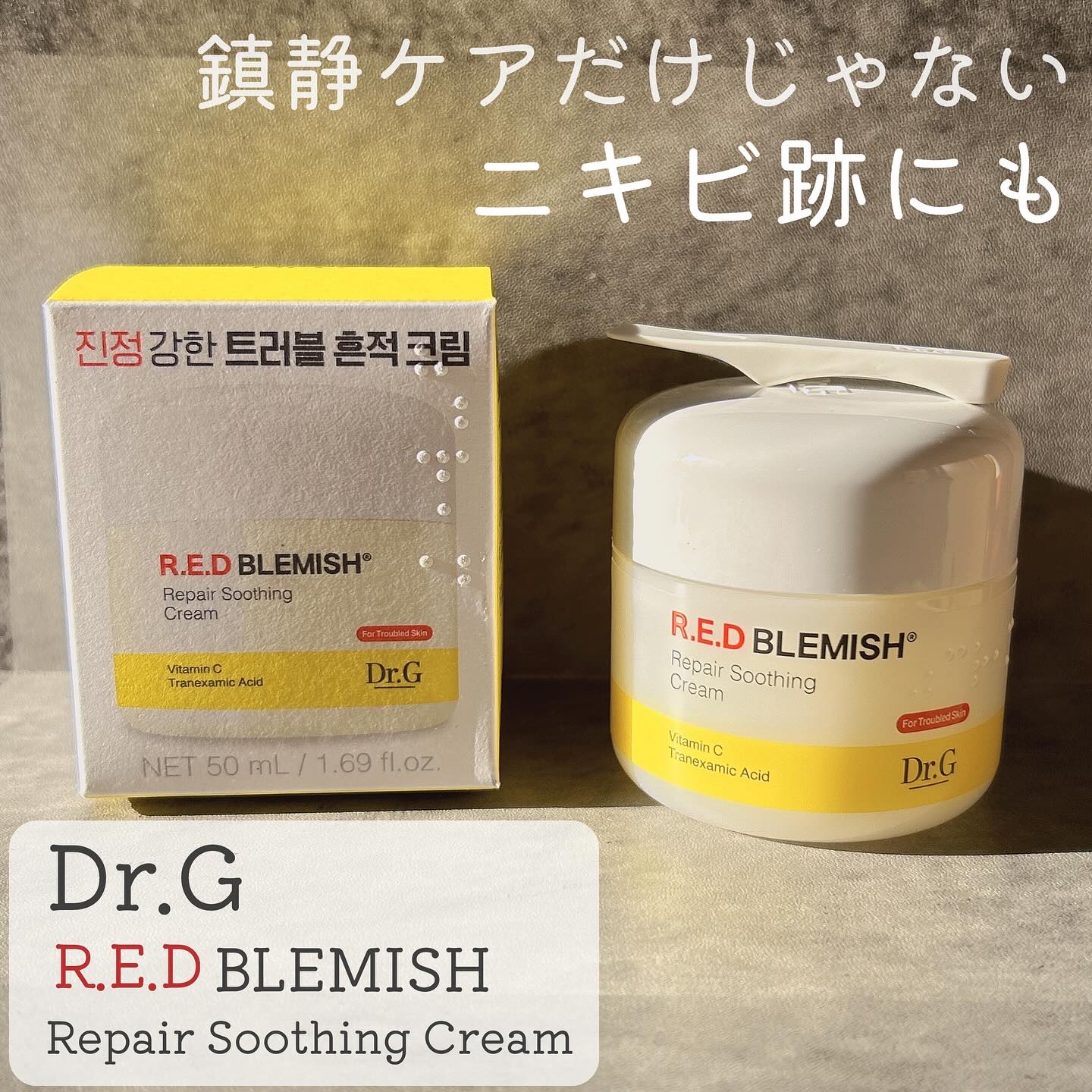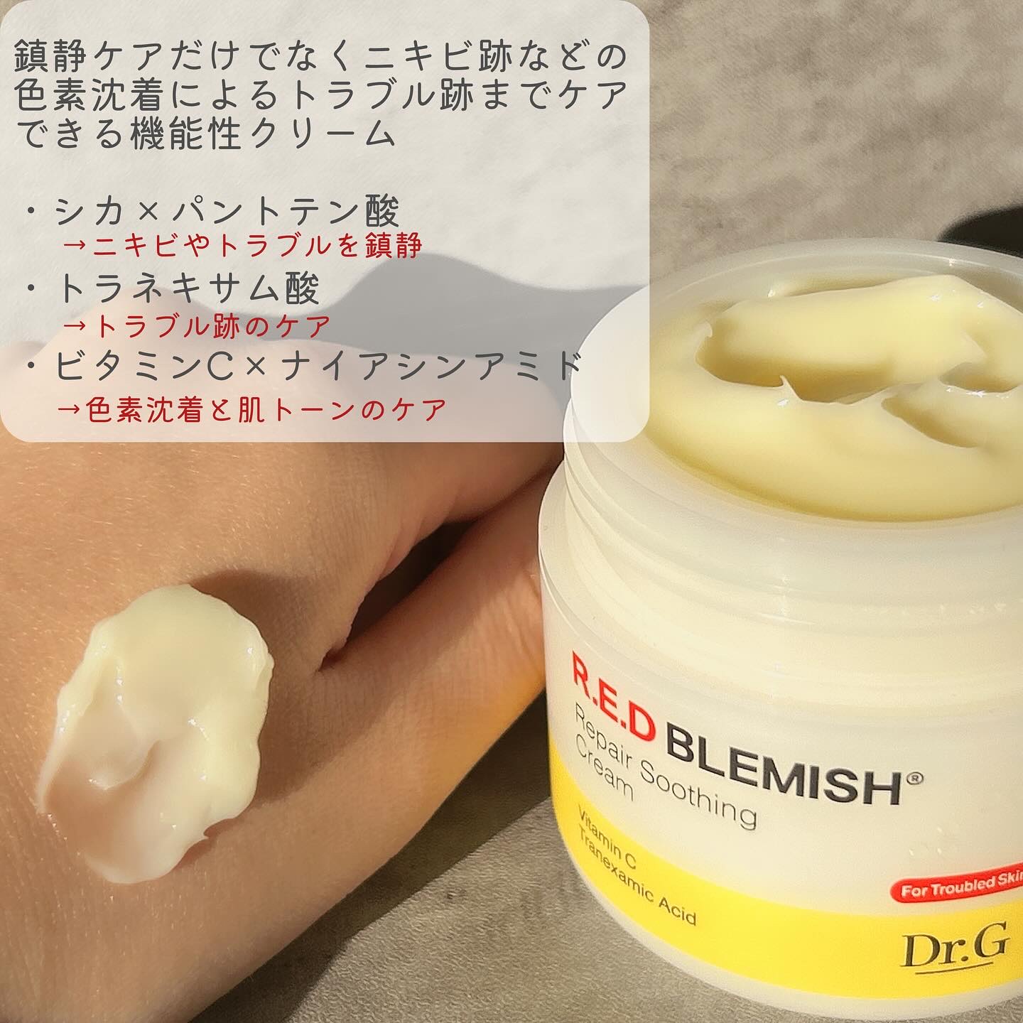 韓国コスメの大人気ブランド【 Dr.G ドクタージー】 今回はレッドブレミッシュシリーズの「レッドブレミッシュリペアスージングクリーム」を使ってみました♪ シカ&パントテン酸でニキビやトラブルを鎮静させてトラネキサム酸がその後をケア。 見ためよりもなめらかでしっとりとしたテクスチャー。肌なじみもよく保湿力もあって乾燥しやすい今の季節にも使いやすいです。