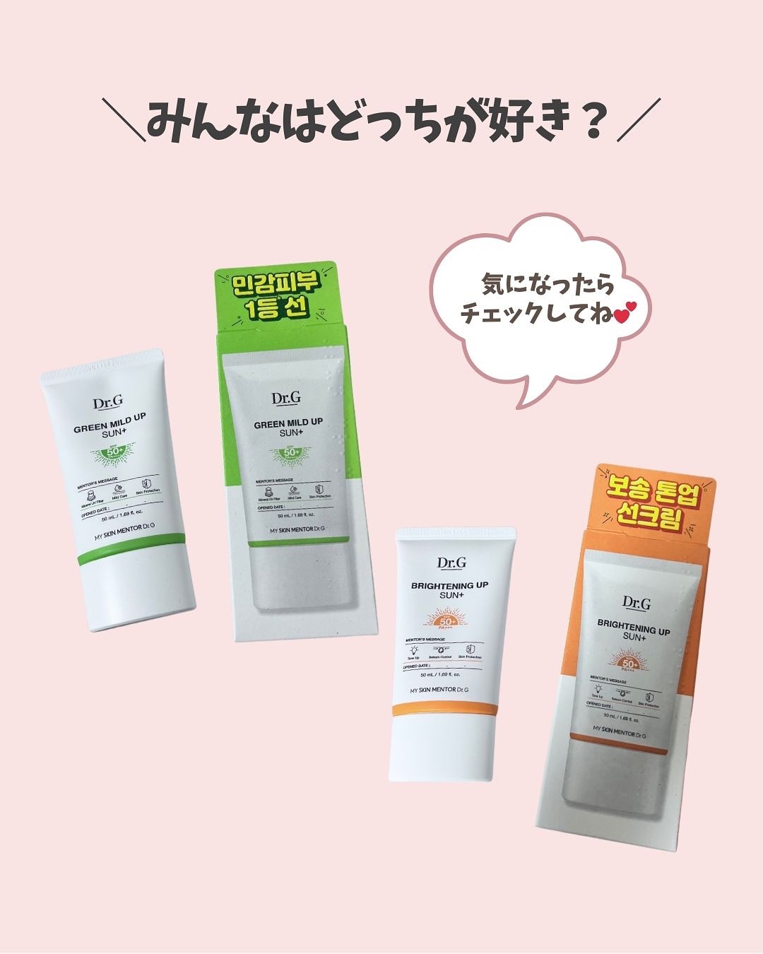 ブライトニングアップサンプラスは化粧下地としても使える日焼け止めです◎ ピーチ色ベースなタイプで、自然にトーンアップ*してくれます🤲´- グリーンマイルドアップサンプラスはオリーブヤングで5年間連続日焼け止め部門受賞🌟⋆꙳ やわらかいクリームタイプでベタつかず密着!! 整肌に効果的なツボクサエキスとハリを向上させるピクノジェノール配合𓂃𓈒 どちらもなめらかによく伸びるから塗りやすいし、コスパもいいなと思ったよ😇🙌