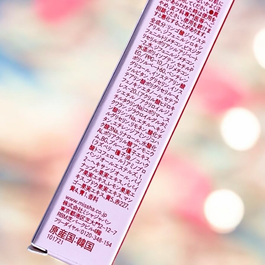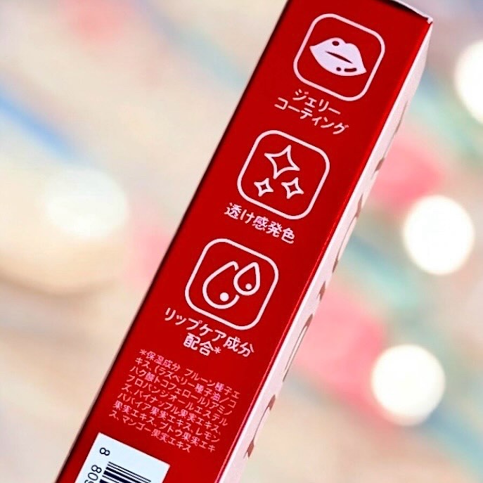- <#1 ピーチジェリー> リンゴ酸ジイソステアリル、ジフェニルシロキシフェニルトリメチコン、ビスジグリセリルポリアシルアジペート-2、水、ジフェニルジメチコン、水添ポリイソブテン、セチルPEG/PPG-10/1ジメチコン、ポリソルベート60、ペンチレングリコール、イソステアリン酸ソルビタン、グリセリン、イソステアリン酸ポリグリセリル-4、フェノキシエタノール、セテアレス-20、酸化チタン、(アクリル酸ヒドロキシエチル/アクリロイルジメチルタウリンNa)コポリマー、スクワラン、マイカ、ジラウロイルグルタミン酸リシンNa、エチルヘキシルグリセリン、リモネン、シリカ、エチレンジアミンジコハク酸3Na、リナロール、水酸化Al、ポリアクリル酸アンモニウム、BG、プルーン種子エキス、(ラズベリー種子油/コハク酸トコフェロール)アミノプロパンジオールエステルズ、1,2-ヘキサンジオール、パイナップル果実エキス、パパイア果実エキス、レモン果実エキス、ブドウ果実エキス、マンゴー果実エキス、黄5、赤227、黄4、青1、香料 <#2 グァバジェリー> リンゴ酸ジイソステアリル、ジフェニルシロキシフェニルトリメチコン、ビスジグリセリルポリアシルアジペート-2、水、ジフェニルジメチコン、水添ポリイソブテン、セチルPEG/PPG-10/1ジメチコン、ポリソルベート60、ペンチレングリコール、イソステアリン酸ソルビタン、グリセリン、イソステアリン酸ポリグリセリル-4、フェノキシエタノール、セテアレス-20、酸化チタン、(アクリル酸ヒドロキシエチル/アクリロイルジメチルタウリンNa)コポリマー、スクワラン、ジラウロイルグルタミン酸リシンNa、エチルヘキシルグリセリン、リモネン、エチレンジアミンジコハク酸3Na、水酸化Al、ポリアクリル酸アンモニウム、リナロール、BG、プルーン種子エキス、(ラズベリー種子油/コハク酸トコフェロール)アミノプロパンジオールエステルズ、1,2-ヘキサンジオール、パイナップル果実エキス、パパイア果実エキス、レモン果実エキス、ブドウ果実エキス、マンゴー果実エキス、赤227、黄4、赤104(1)、黄5、青1、香料 <#3 チェリージェリー> リンゴ酸ジイソステアリル、ジフェニルシロキシフェニルトリメチコン、ビスジグリセリルポリアシルアジペート-2、水、ジフェニルジメチコン、水添ポリイソブテン、セチルPEG/PPG-10/1ジメチコン、ポリソルベート60、ペンチレングリコール、イソステアリン酸ソルビタン、グリセリン、イソステアリン酸ポリグリセリル-4、フェノキシエタノール、セテアレス-20、(アクリル酸ヒドロキシエチル/アクリロイルジメチルタウリンNa)コポリマー、スクワラン、ジラウロイルグルタミン酸リシンNa、エチルヘキシルグリセリン、リモネン、酸化チタン、エチレンジアミンジコハク酸3Na、リナロール、水酸化Al、ポリアクリル酸アンモニウム、BG、プルーン種子エキス、(ラズベリー種子油/コハク酸トコフェロール)アミノプロパンジオールエステルズ、1,2-ヘキサンジオール、パイナップル果実エキス、パパイア果実エキス、レモン果実エキス、ブドウ果実エキス、マンゴー果実エキス、黄5、赤227、黄4、青1、香料 <#4 マンゴージェリー> リンゴ酸ジイソステアリル、ジフェニルシロキシフェニルトリメチコン、ビスジグリセリルポリアシルアジペート-2、水、ジフェニルジメチコン、水添ポリイソブテン、セチルPEG/PPG-10/1ジメチコン、ポリソルベート60、ペンチレングリコール、イソステアリン酸ソルビタン、グリセリン、イソステアリン酸ポリグリセリル-4、フェノキシエタノール、セテアレス-20、酸化チタン、(アクリル酸ヒドロキシエチル/アクリロイルジメチルタウリンNa)コポリマー、スクワラン、ジラウロイルグルタミン酸リシンNa、エチルヘキシルグリセリン、リモネン、エチレンジアミンジコハク酸3Na、水酸化Al、ポリアクリル酸アンモニウム、リナロール、BG、プルーン種子エキス、(ラズベリー種子油/コハク酸トコフェロール)アミノプロパンジオールエステルズ、1,2-ヘキサンジオール、パイナップル果実エキス、パパイア果実エキス、レモン果実エキス、ブドウ果実エキス、マンゴー果実エキス、黄5、黄4、赤227、青1、香料 <#5 フィグジェリー> リンゴ酸ジイソステアリル、ジフェニルシロキシフェニルトリメチコン、ビスジグリセリルポリアシルアジペート-2、水、ジフェニルジメチコン、水添ポリイソブテン、セチルPEG/PPG-10/1ジメチコン、ポリソルベート60、ペンチレングリコール、イソステアリン酸ソルビタン、グリセリン、イソステアリン酸ポリグリセリル-4、フェノキシエタノール、セテアレス-20、(アクリル酸ヒドロキシエチル/アクリロイルジメチルタウリンNa)コポリマー、スクワラン、ジラウロイルグルタミン酸リシンNa、エチルヘキシルグリセリン、リモネン、エチレンジアミンジコハク酸3Na、酸化チタン、リナロール、水酸化Al、ポリアクリル酸アンモニウム、BG、プルーン種子エキス、(ラズベリー種子油/コハク酸トコフェロール)アミノ
