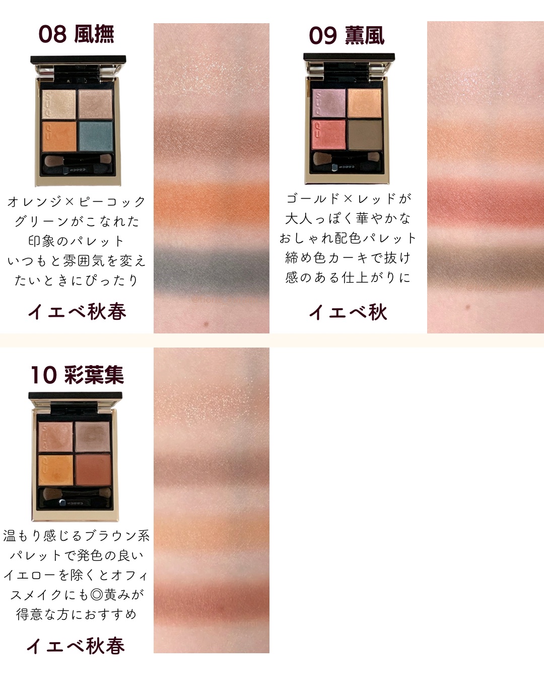 屏風絵に描かれた春の光や花の艶やかさをまぶたに描くアイシャドウパレット 静寂な絵に内包された春の花々の華やかさ、可憐さ。 柔らかなベージュ配色ですが、ツヤツヤキラキラで存在感抜群です 同系色ですが、重ねる順番を変えると、また雰囲気が少し変わりそう🤍 定番色で嬉しいぃ〜🙌🏻✨