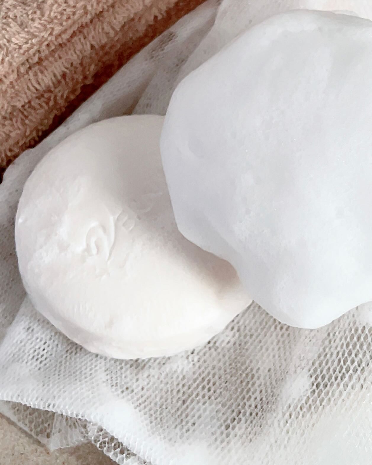 薬用アンクソープ メイクや古い角質、毛穴の奥の皮脂汚れまで不要なものを「落とす」クレンジング石けん 24種類の美容成分を配合した肌のキメを「整える」仕上げ用石けん 付属の泡立てネットを使って泡立てると、もちもちふわふわの濃密泡ができました‼️かなり弾力があって逆さまにしても落ちないよ🫢