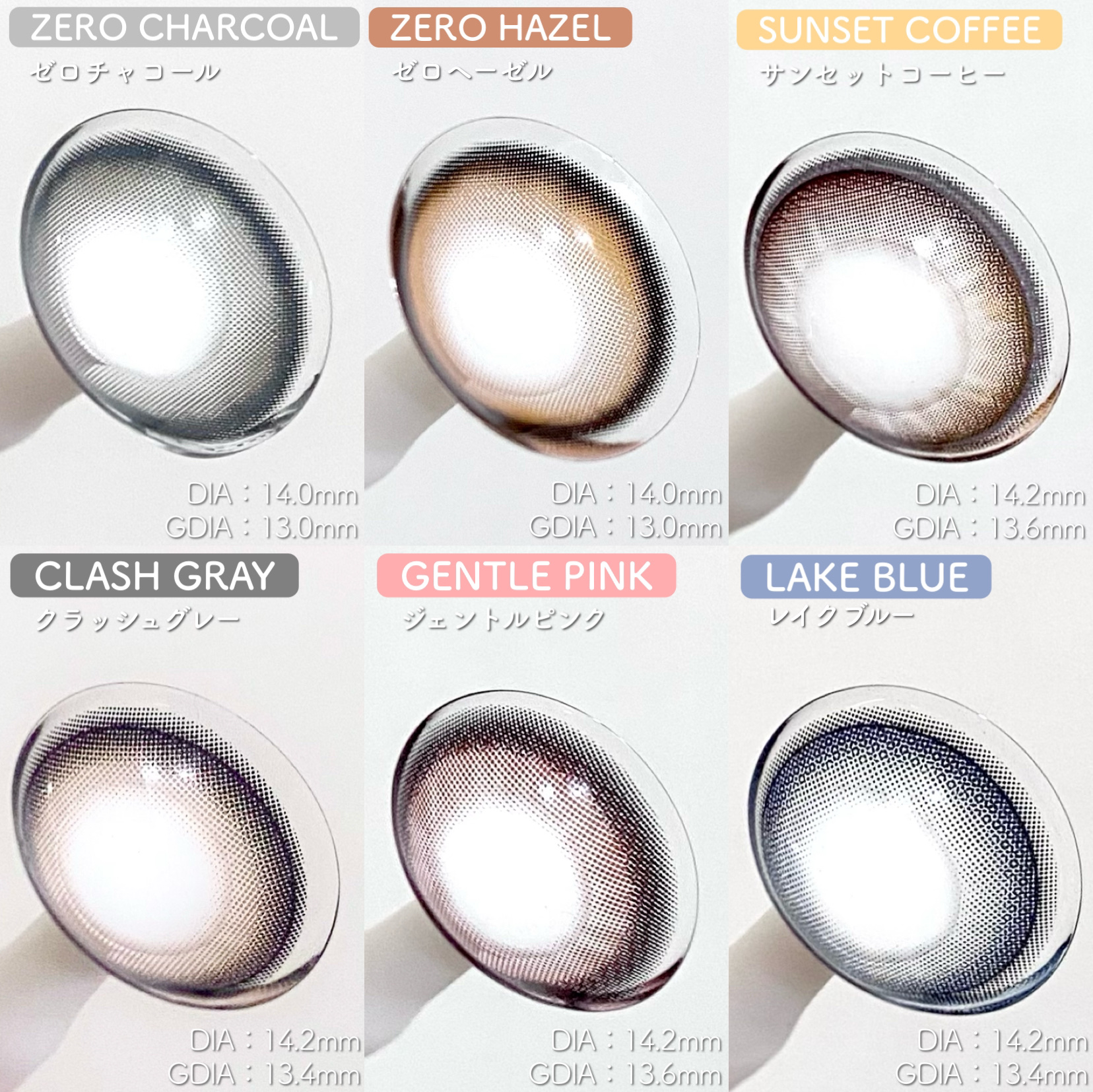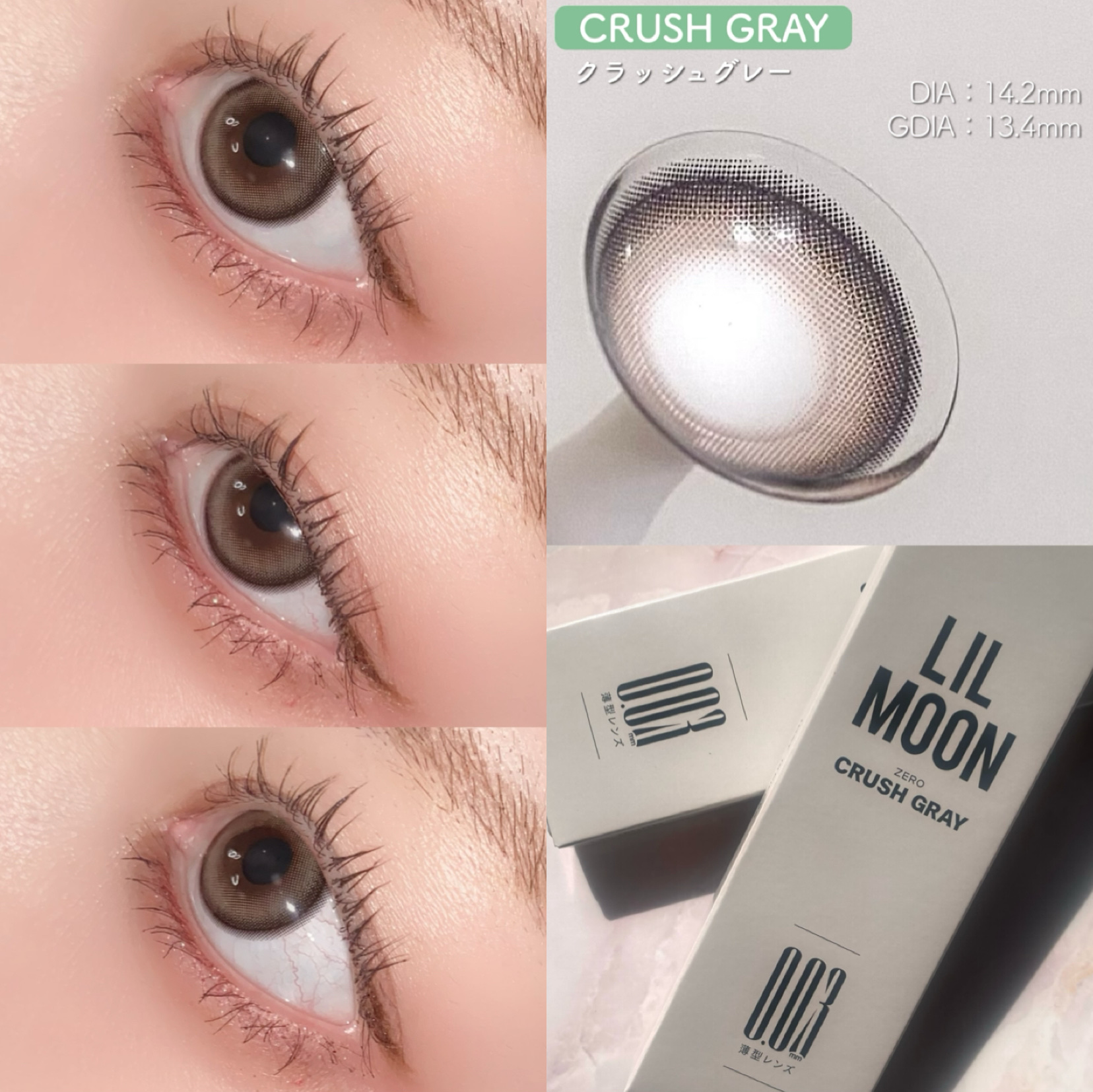 - "ZERO”感つけ心地、きらめきUP! (1)全度数0.03mm極薄*1*2 LILMOON(リルムーン)「0.03シリーズ」は、全度数レンズの中心厚が0.03㎜で、レンズが薄く厚みが少ない分、まるで裸眼のような快適な付け心地で異物感を感じにくいです。 (2) 全度数酸素透過率DK/t:45 『LIL MOON(リルムーン)』0.03シリーズは全度数レンズの酸素透過率DK/t:45、従来の含水率38%通常厚レンズと比べ2倍以上*2の酸素透過率を実現し、酸素不足による充血を軽減。高い保水力を持つMPCポリマーを保存液に配合し、乾燥や目のゴロゴロ感を軽減。 (3)気分で選べるクリアレンズとカラーレンズ 多彩な瞳も、自然な瞳も,カラコンとクリアレンズ、どちらも揃う。カラコンお試しサイズ2枚入りを用意、気軽にお試しできちゃう。幅広いラインナップで、瞳に自信と輝きをプラス、毎日のスタイルを自由に楽しめる! <クラッシュグレー> センス◎!やりすぎないアクセントで、馴染みのいいアッシュグレーアイ <サンセットコーヒー> ちゅるんと透明感UP演出! 落ち着いた水光ブラウンアイ <ジェントルピンク> クリっと瞳を際立たせるふんわり太フチと、 優しいほんのりピンクアイ <ゼロインク> ダークウッドをイメージしたブラックレンズ、透明感あふれるクリっとした瞳 <ゼロヘーゼル> 大人っぽいブラウンに差し込む ヘーゼルカラー、オシャレなブラウンアイ <ゼロチャコール> 落ち着いたダークグレーにブルー でアクセント、クールな大人アイ <レイクブルー> ほどよいフチ感で立体感見え重視、深みのあるダークブルーアイ *1:使用感には個人差があります *2:当社製品比較 カラーコンタクトレンズの不適正使用による眼障害の危険性等などがあります。 ●コンタクトレンズは高度管理医療機器です。不十分な洗浄・消毒など不適切なケアや、長時間・交換期間を超えた装用により、アレルギー性結膜炎、角膜感染症、角膜潰瘍等の重篤な眼障害が発生する危険性があります ●ご使用前に取扱説明書を確認してください 使用上の留意事項 ●眼科医院等を受診してからお求めください ●眼に異常を感じたら直ちにレンズ使用を中止し、お近くの眼科等で診察を受けてください ●医師の指示にしたがってご使用ください ●コンタクトレンズを装用する場合、自覚症状がなくても、眼科医院等での定期検査を受けてください ●レンズに不具合がある場合は使用しないでください
