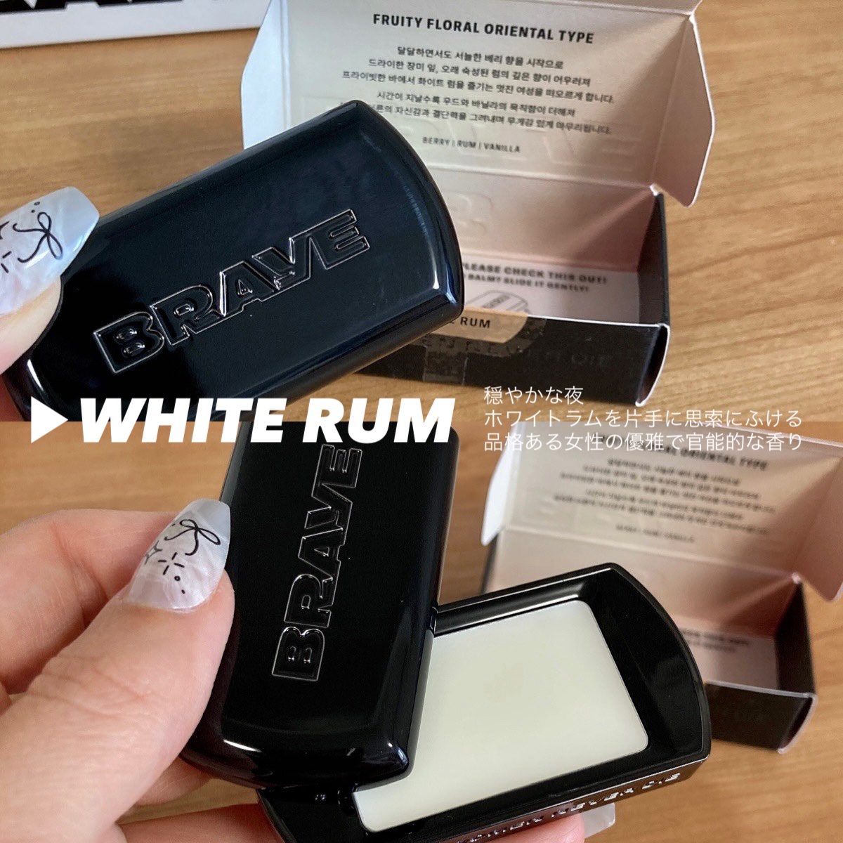 - センティッドバームは、クールで洗練された女性のスタイルを完成させるラストタッチとして誕生した「ソリッドパフューム」です。 アクティブな日々をエレガントに楽しむ女性から、静かで落ち着いた日常を慈しむ女性まで、BRAYEだけが持つ独特なムードをどこでも手軽に、そして魅力的にお楽しみいただけます。 ●ホワイトラム 穏やかな夜、ホワイトラームを片手に思索にふける品格のある女性の優雅で官能的な香り 甘くも冷ややかなベリー系の香りで始まり、ドライローズのローズ、バニラの風味を儚い香りと、 じっくりと熟成されたラムの深みが調和し、落ち着いた夜、静かなバーでホワイトラムを傾けながら思索にふける上品な女性を訪仏させます。 ●ブルージーンズ ブルージーンズのクールで爽やかな雰囲気と、瑞々しいシトラスが放つ その日に安らぎと解放感を込めた、心地よい香り。 瑞々しいタンジェリンの香りに新鮮なトマトリーフが加わり、誘き通る青空の下でブルージーンズを身に纏い、 自由な気持ちで街を歩くような心の安らぎがすっきりとした香りと共に広がります。