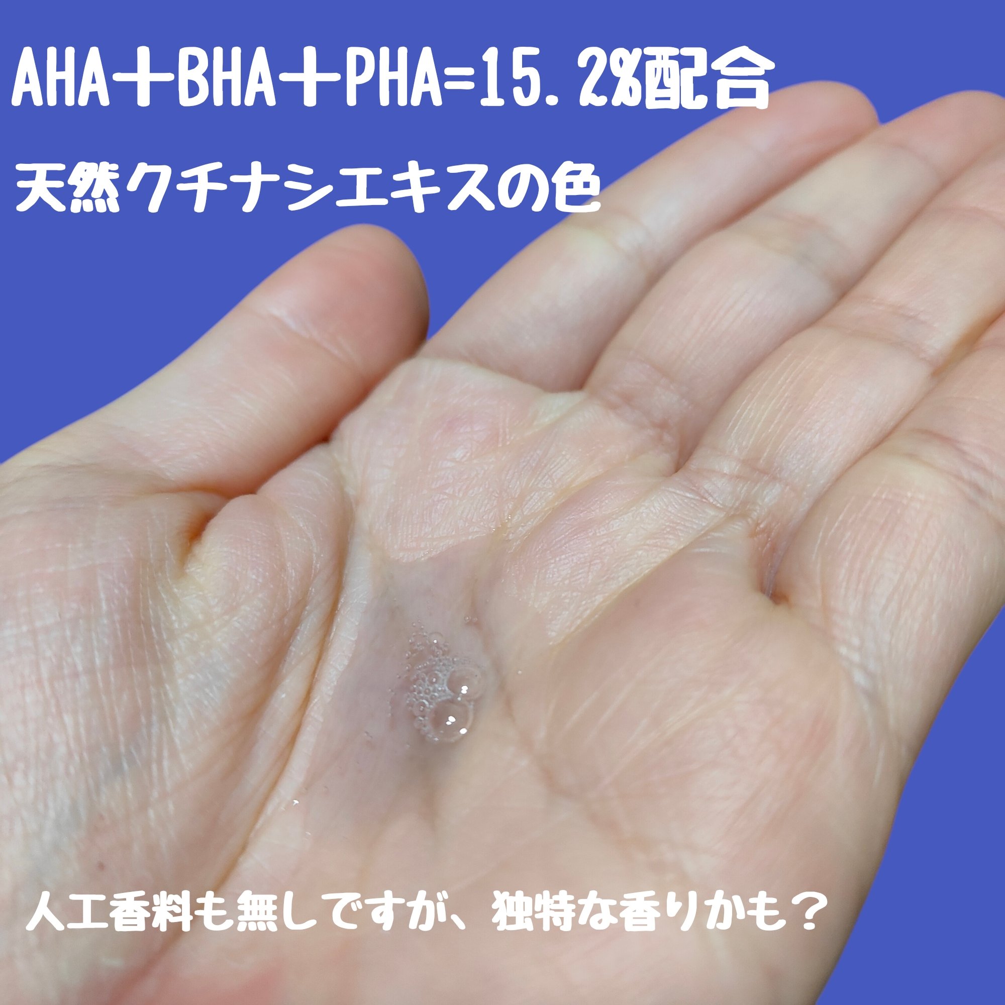 ほんのり青い色味のセラム。自然から得たクチナシエキスによる青色で人工色素は不使用。 サラッとしたみずみずしいセラムで肌にスルスル馴染ませやすい。馴染ませるとしっとり。 AHA(角質ケア)1%、BHA(毛穴内の角質ケア)0.2%、PHA(3世代ピーリングケア)14%合計15.2%含有。